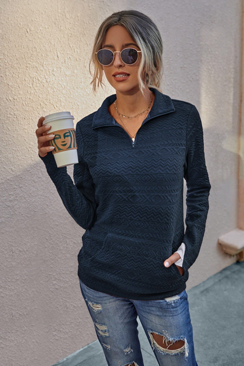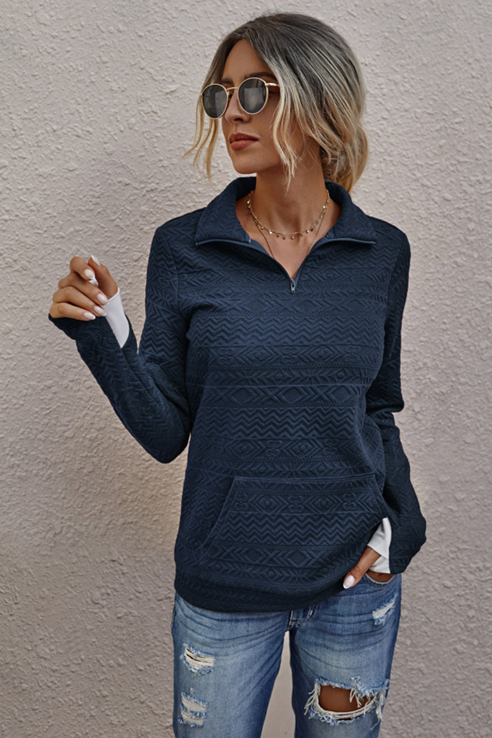 Tröjan har en modern design med långa ärmar och en praktisk dragkedja, vilket gör den idealisk för både vardag och fest. Den mjuka polyesterkvaliteten ger en behaglig känsla mot huden och gör att tröjan sitter bra.