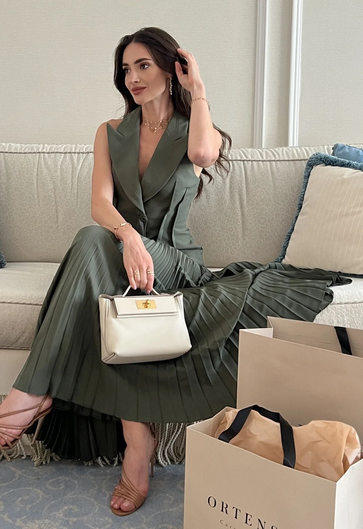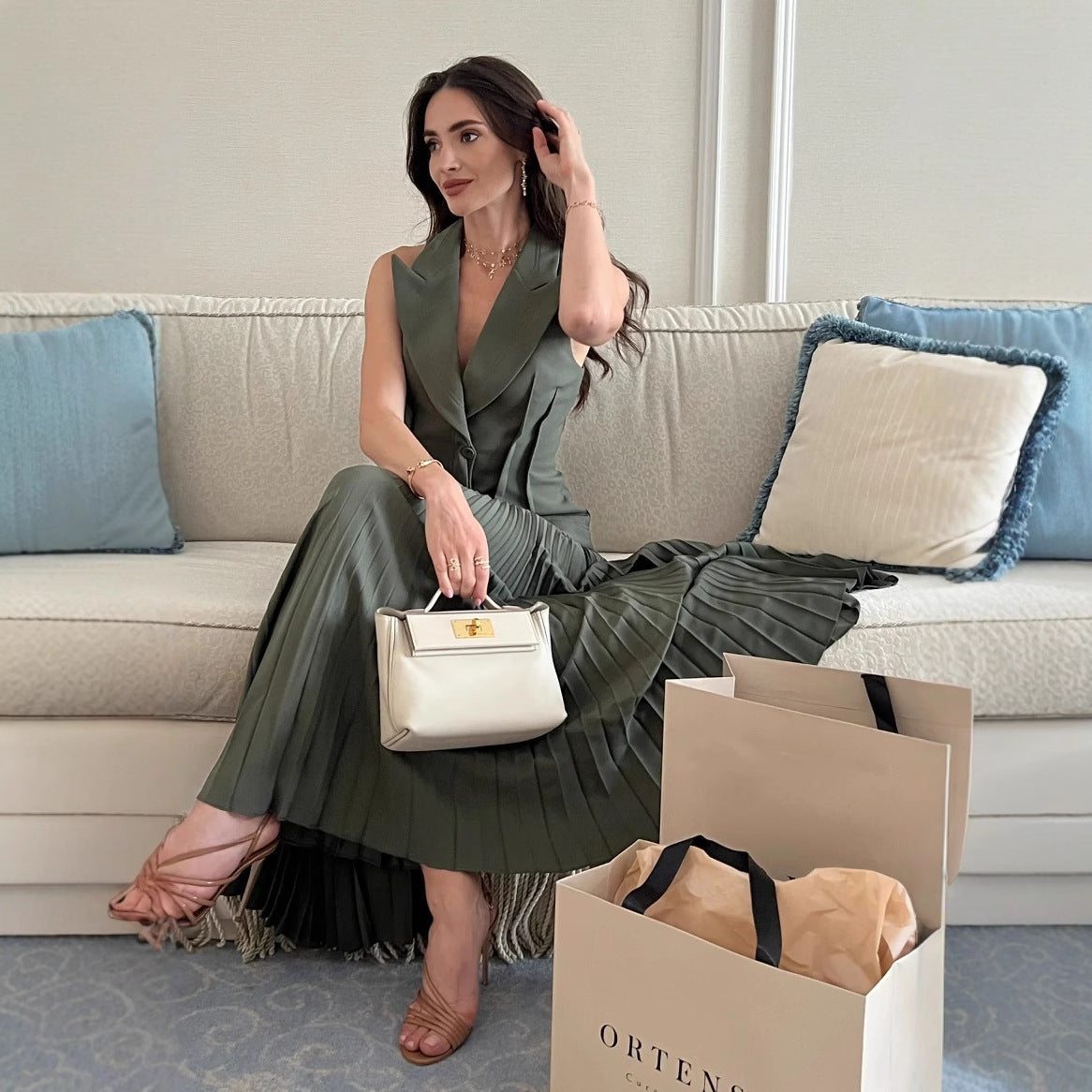 Denna outfit är designad med fokus på både stil och funktionalitet. Västens ärmlösa design och kjolens vikning skapar en modern look som passar utmärkt för olika tillfällen, från vardag till fest.
