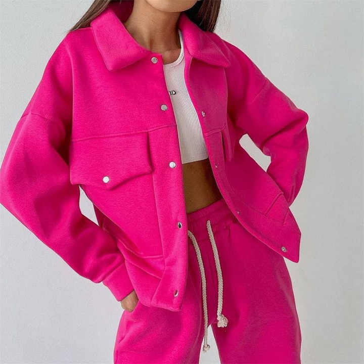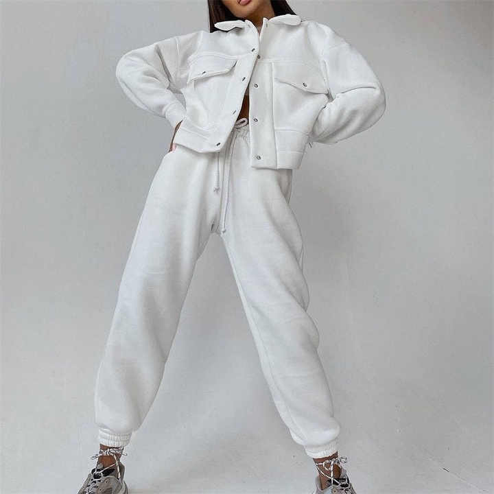 Denna dräkt består av en långärmad jacka och matchande joggingbyxor, vilket gör den idealisk för både träning och avslappning. Med sitt mjuka och andningsbara tyg erbjuder den en lätt och flexibel passform som gör att du kan röra dig fritt.