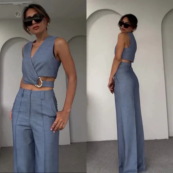 Denna uppsättning är designad för den moderna kvinnan som uppskattar både stil och funktionalitet. Den korta blusen har stiliga detaljer och fräscha färger, medan de högre byxorna skapar en smickrande silhuett. Perfekt för brunch med vänner, kontoret eller en utekväll.