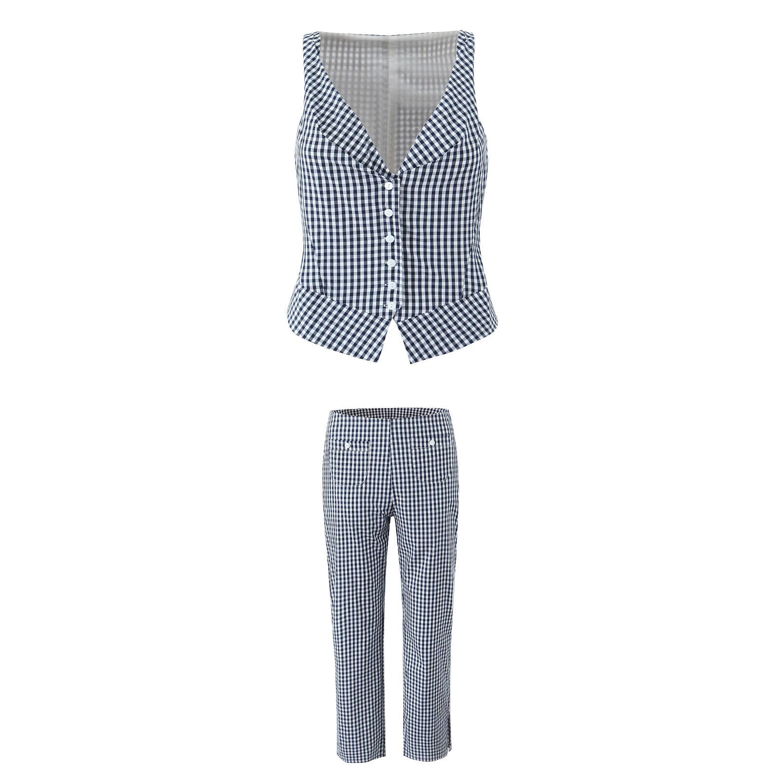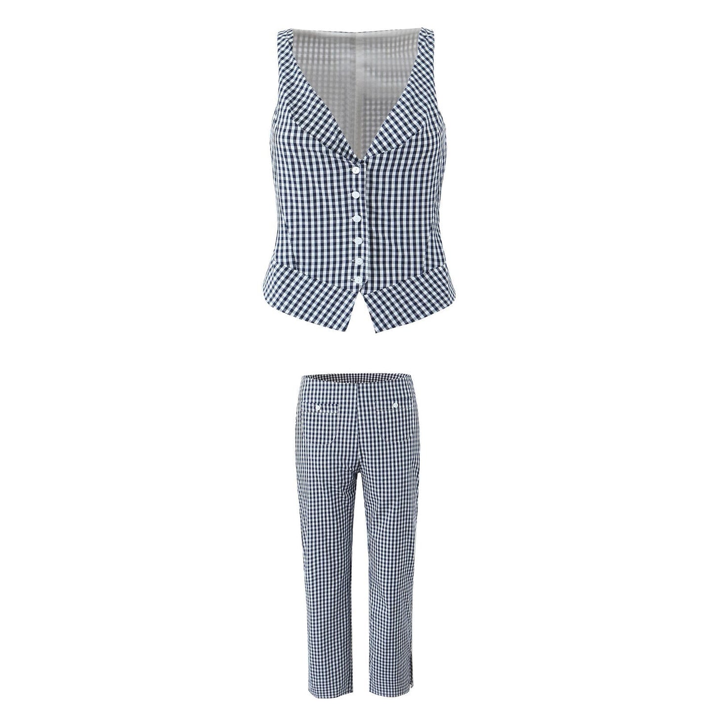 Detta set kombinerar en v-ringad väst med långa byxor, vilket skapar en modern och trendig look. Designen är inspirerad av street fashion och passar utmärkt för både vardag och sociala tillställningar.