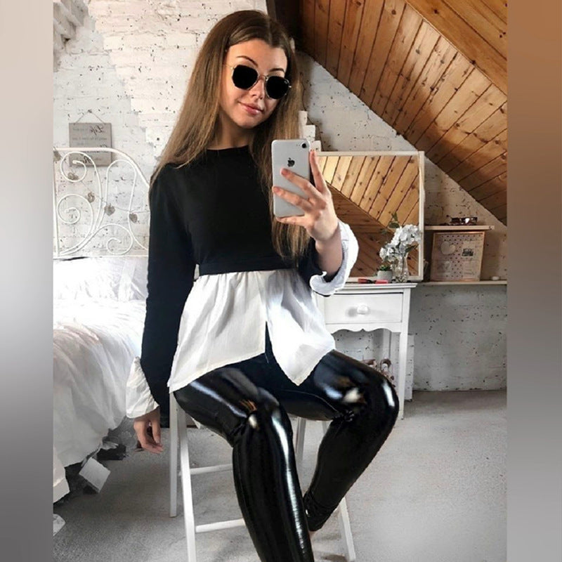 Blusskjortan har en kreativ två-i-ett-design som kombinerar en elegant topp med en lös nedre del. Den cirkulära halsringningen ger ett avslappnat utseende, medan de långa ärmarna tillför en feminin touch, vilket gör den idealisk för både avslappnade och eleganta tillfällen.