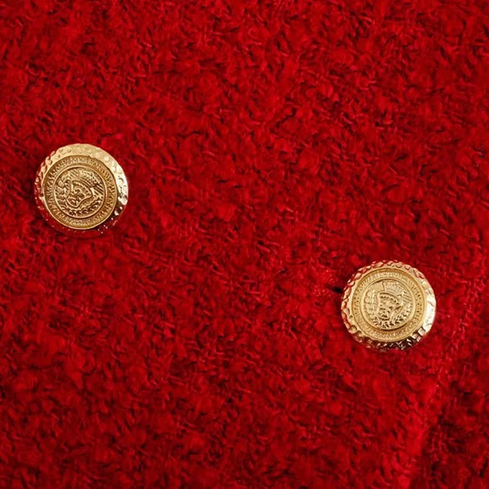 Setet inkluderar en dubbel blazer med guldknappar som framhäver den sofistikerade stilen, medan minikjolen ger en söt och lekfull touch. Denna outfit är idealisk för både kontoret och sociala tillställningar, vilket gör den till ett mångsidigt val för din garderob.