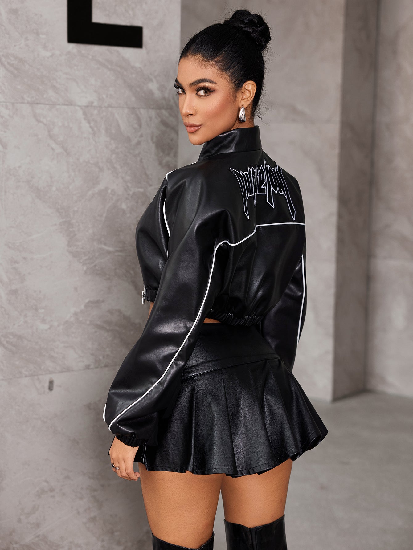 Damjacka Bomberjacka Kontrast PU-Läder Modern Beskuren Passform