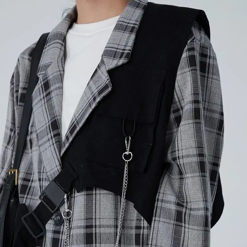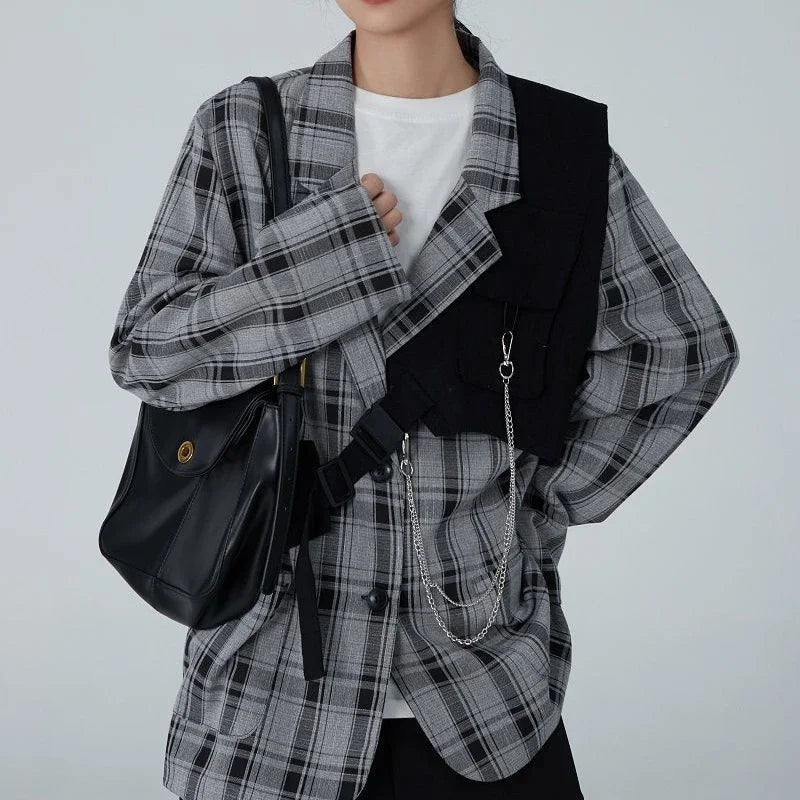 Denna jacka är en elegant tolkning av den klassiska blazern, med ett rutigt mönster i gråa toner som ger en vild och modern look. Kedjetillbehören tillför en unik dimension, vilket gör den idealisk för både kontoret och avslappnade tillfällen.