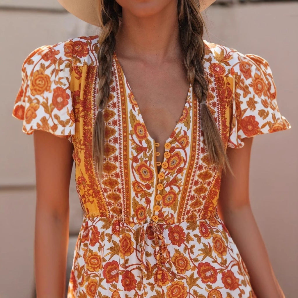 Upplev en känsla av elegans och komfort med vår damklänning med blommig design. Denna klänning är perfekt för varma dagar och speciella tillfällen, vilket gör att du alltid känner dig vacker.