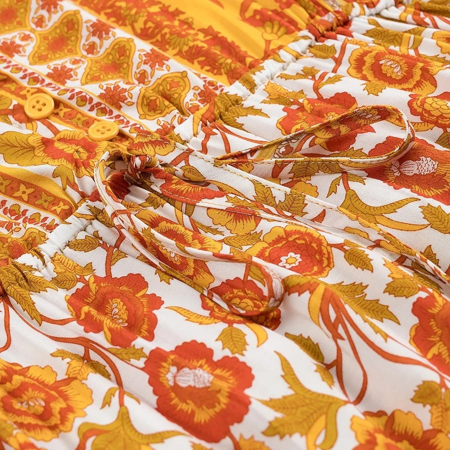 Klänningen har ett lekfullt blommönster som utstrålar livlighet och friskhet. Den elastiska midjan ger en smickrande passform som framhäver din silhuett, medan det andningsbara materialet säkerställer maximal komfort under hela dagen.