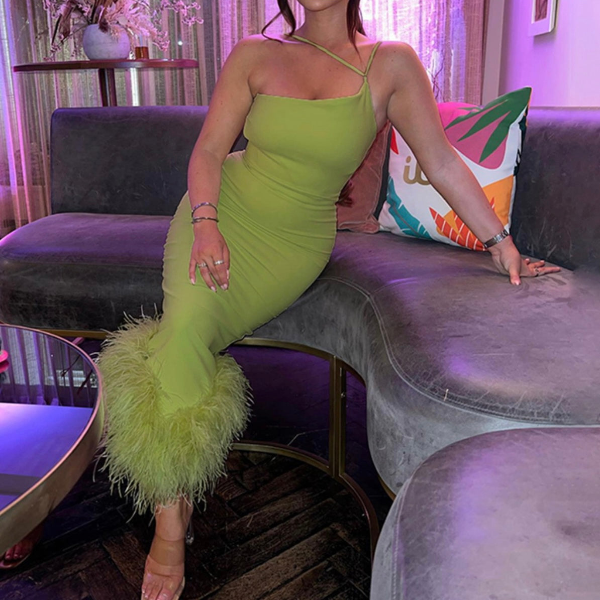 Klänningen har en smal, ärmlös snitt med en vågig ryggfri detalj som ger en modern känsla. Den asymmetriska vårapplikationen på nederkanten tillför en extra dimension och gör att du verkligen sticker ut i mängden.