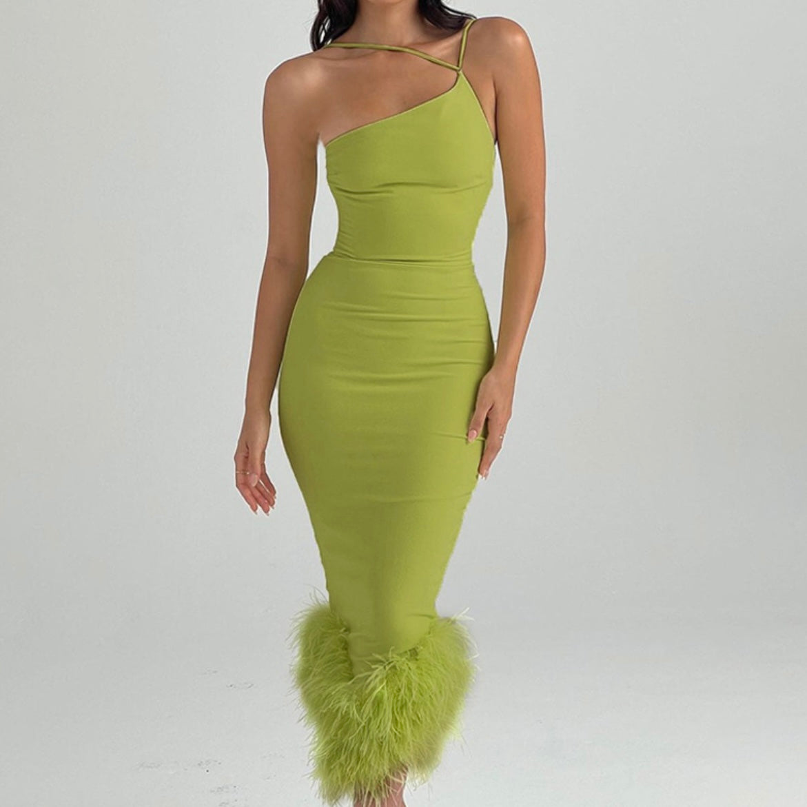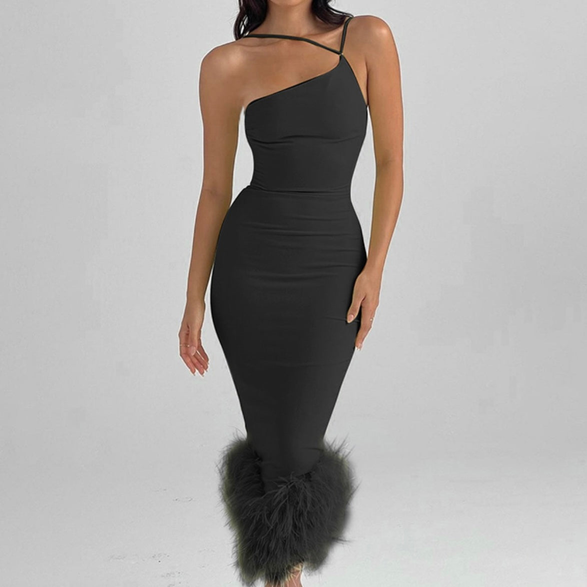 Upplev elegansen med denna en-axelklänning som kombinerar stil och dramatik. Perfekt för kvällsfester och klubbkvällar, kommer denna klänning att få dig att känna dig självsäker och unik.