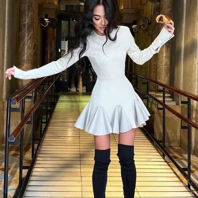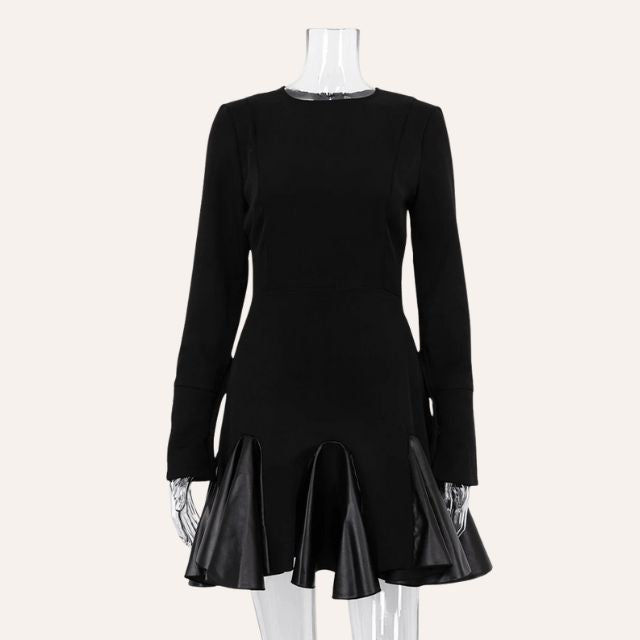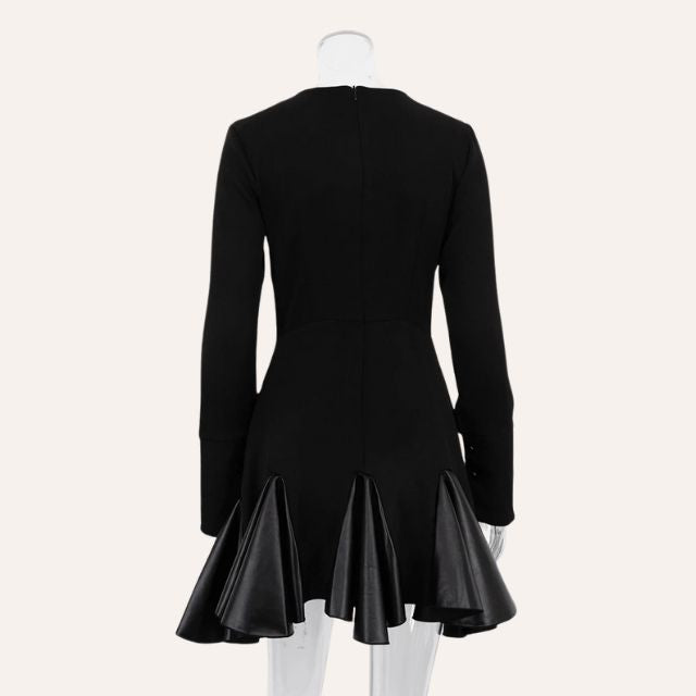 Denna klänning har en monokrom svart överdel som vackert kontrasterar med den veckade kjolen i syntetiskt läder. Den slående designen gör den idealisk för kvällsevenemang, och den smala silhuetten ger en tidlös look.