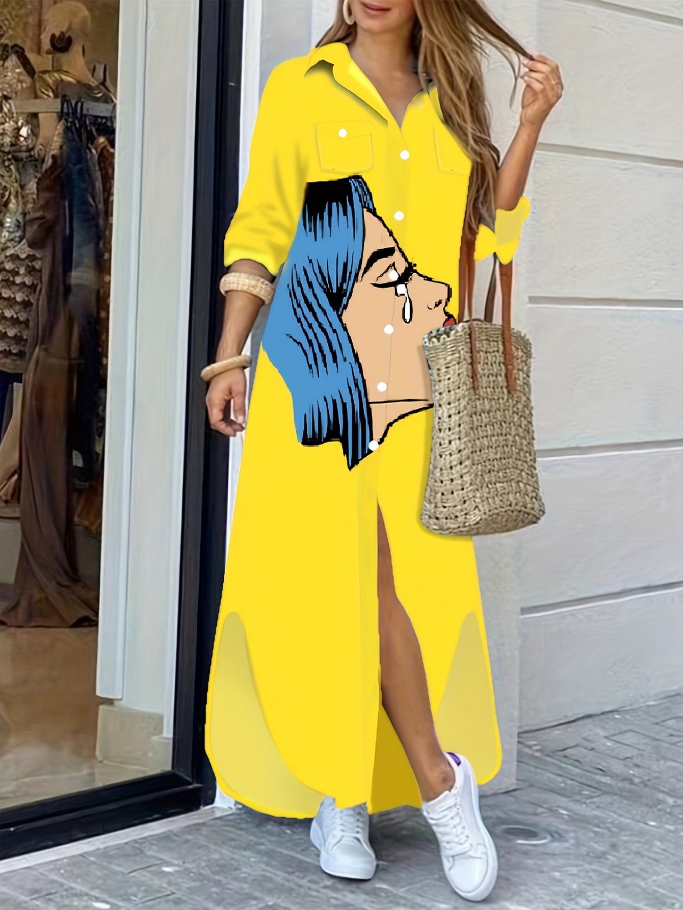 Damklänning Midi Långärmad Polyester med Ansiktstryck och Skjortkrage