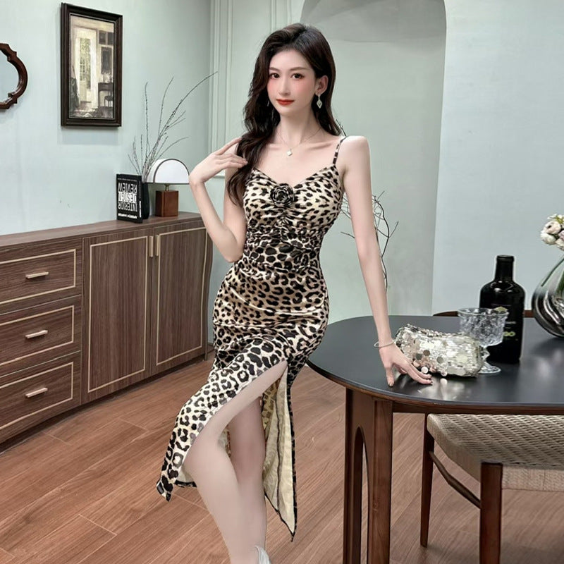 Denna klänning har ett iögonfallande leopardmönster och en elegant V-ringning som framhäver din stil. Med sin midi-längd och spaghetti band är den både bekväm och trendig, vilket gör den till ett utmärkt val för alla säsonger.
