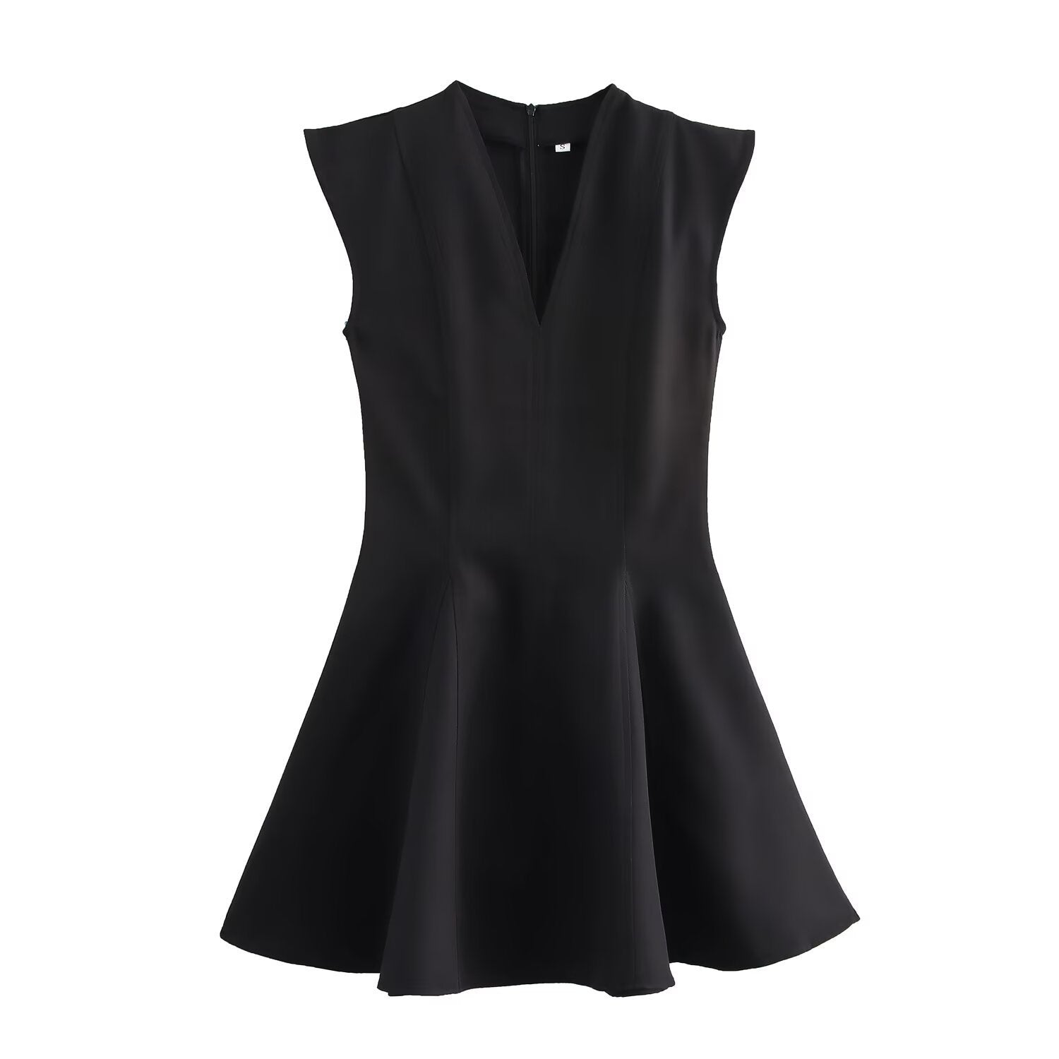 Denna klänning har en A-linjeformad kjol som ger en smickrande silhuett. Den svarta färgen gör den lätt att styla för olika tillfällen, från avslappnade utflykter till festliga evenemang.