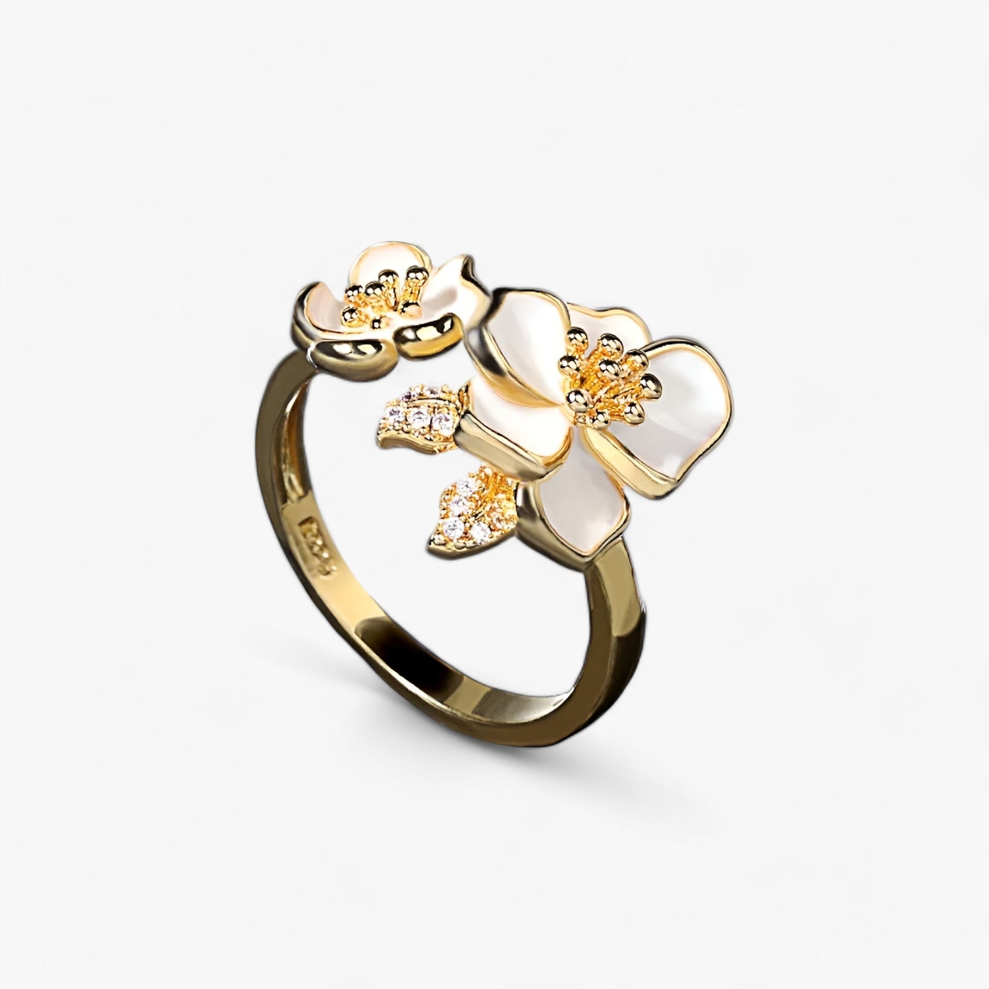 Upplev skönheten i vår damring med vit blommig design, som ger en känsla av elegans och stil. Denna ring är perfekt för både vardagligt bruk och speciella tillfällen, vilket gör den till ett oumbärligt smycke i din kollektion.