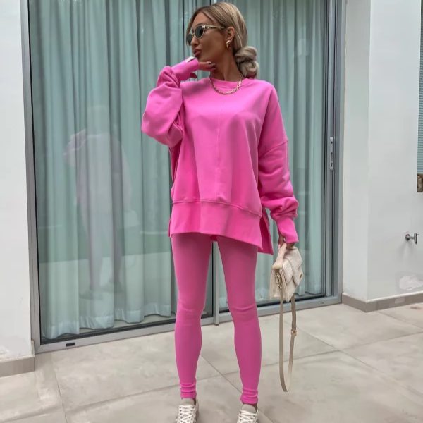 Uppsättningen består av en högkvalitativ topp och matchande byxor, designade för att harmonisera och ge en modern look. Den andningsbara kvaliteten gör att materialet känns mjukt mot huden, vilket säkerställer komfort hela dagen. Toppen har ett modernt snitt och kan enkelt kombineras med jeans eller leggings, medan byxorna har en flexibel midja för extra bekvämlighet.