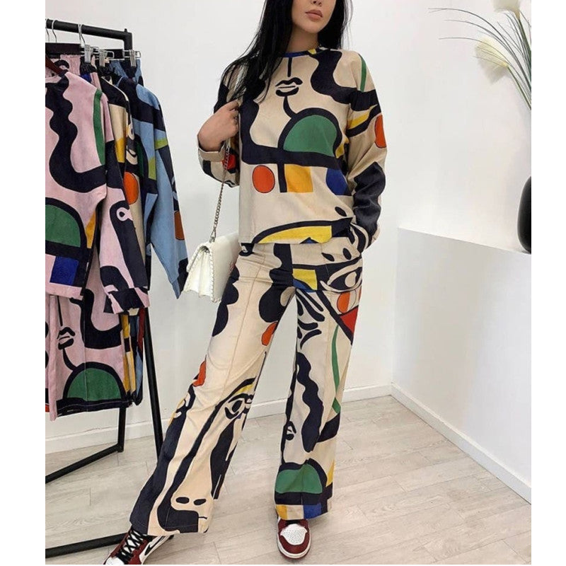 Upplev en unik stil med detta trendiga damset som kombinerar graffiti tryck med raka benbyxor. Perfekt för avslappnade dagar när du vill känna dig både bekväm och stilfull.