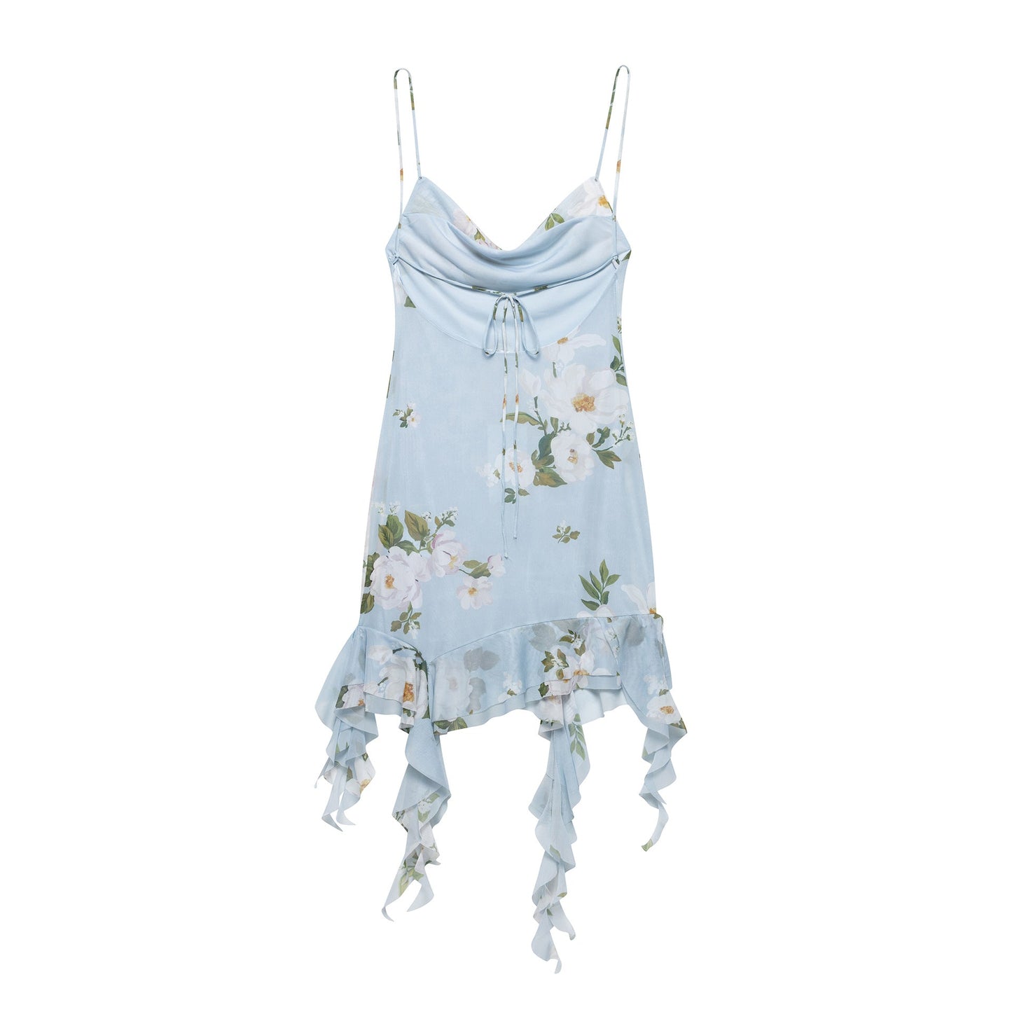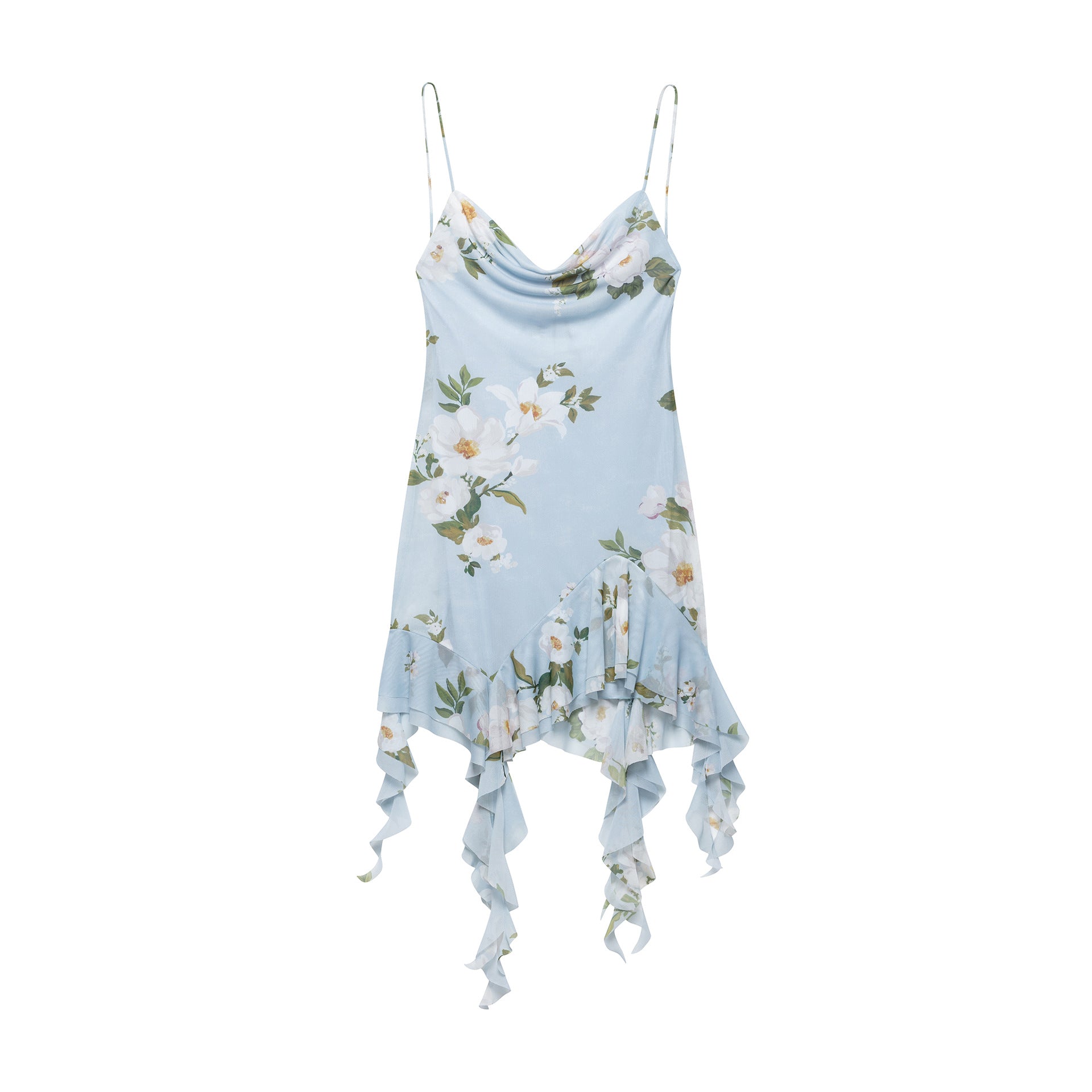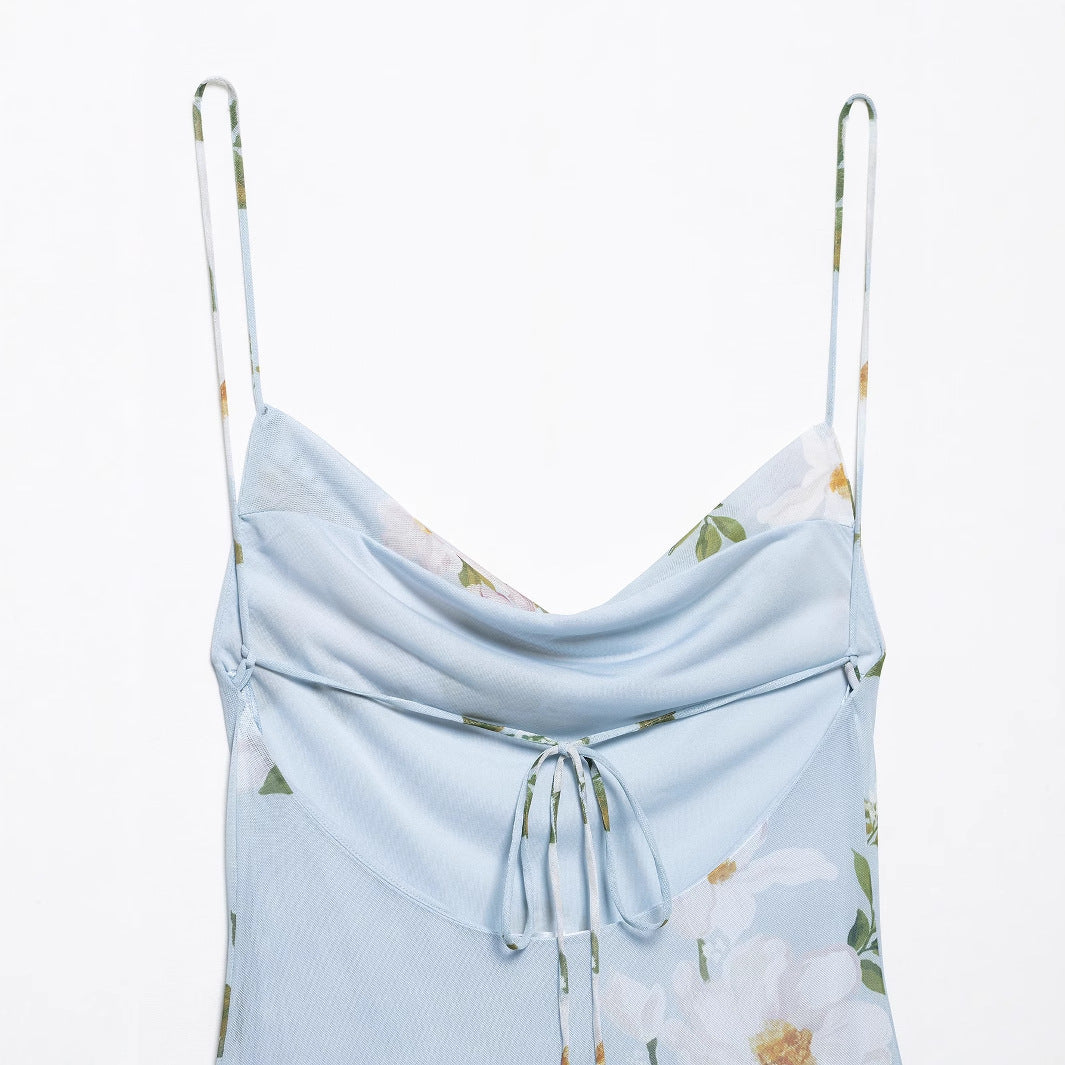 Klänningen har ett graciöst blommigt tryck i milda färger, vilket gör den perfekt för sommaren. Med tunna, justerbara spaghetti-bärare kan du enkelt anpassa passformen för att känna dig bekväm och stilfull.