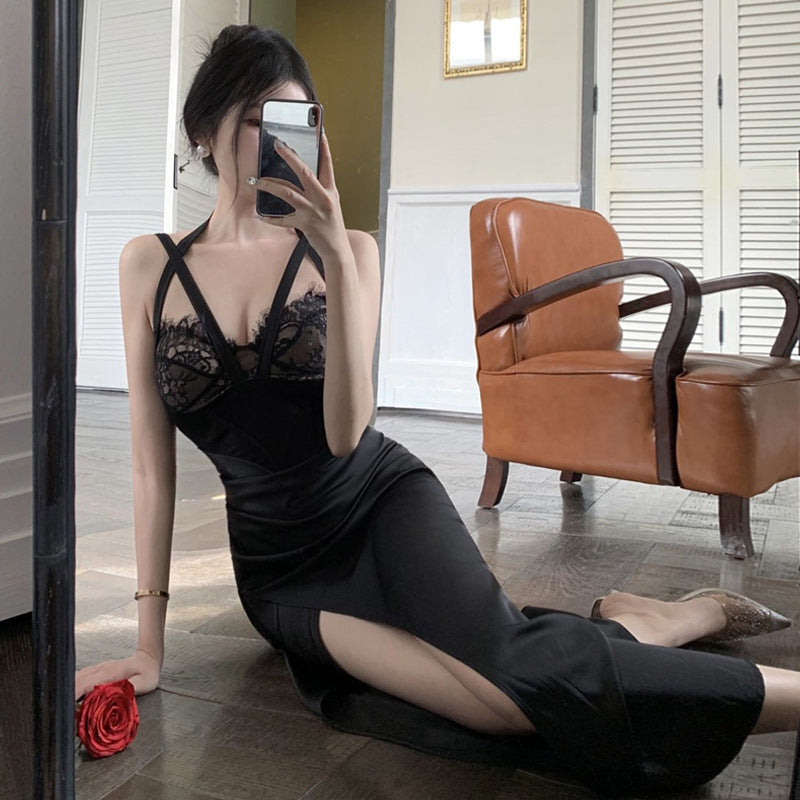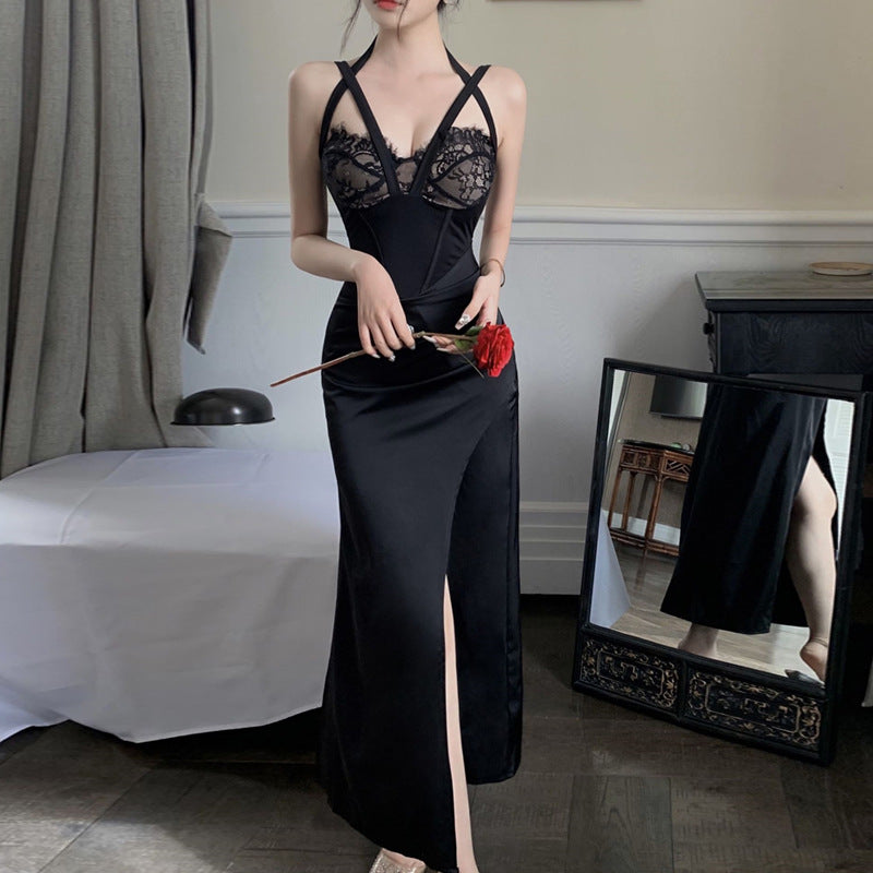 Denna klänning har en lång kjol med en v-cut och en stilren design som passar perfekt för både festliga och avslappnade tillfällen. Med sina spaghetti band och en unik patchwork-design, är den både modern och tidlös.