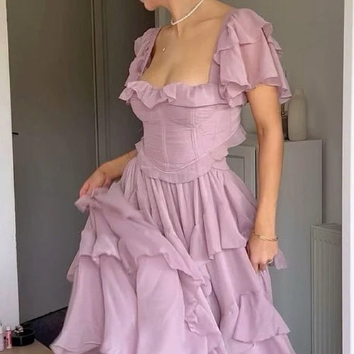 Klänningen har en vacker U-ringning och rüschenkanten som ger en lekfull och romantisk känsla. Den är idealisk för festligheter, födelsedagskalas eller andra speciella evenemang där stil och komfort är viktigt.
