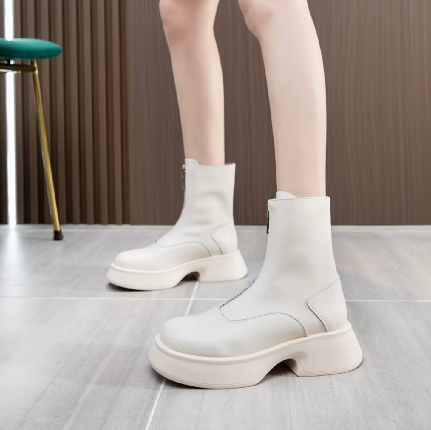Dessa kortklippta stövlar kombinerar funktion och stil med ett varmt pälsfoder som ger extra komfort. Den moderna dragkedjan fram ger en chic accent och gör det enkelt att ta på och av stövlarna, medan den klassiska silhuetten ger ett skräddarsytt utseende som passar perfekt till olika outfits.