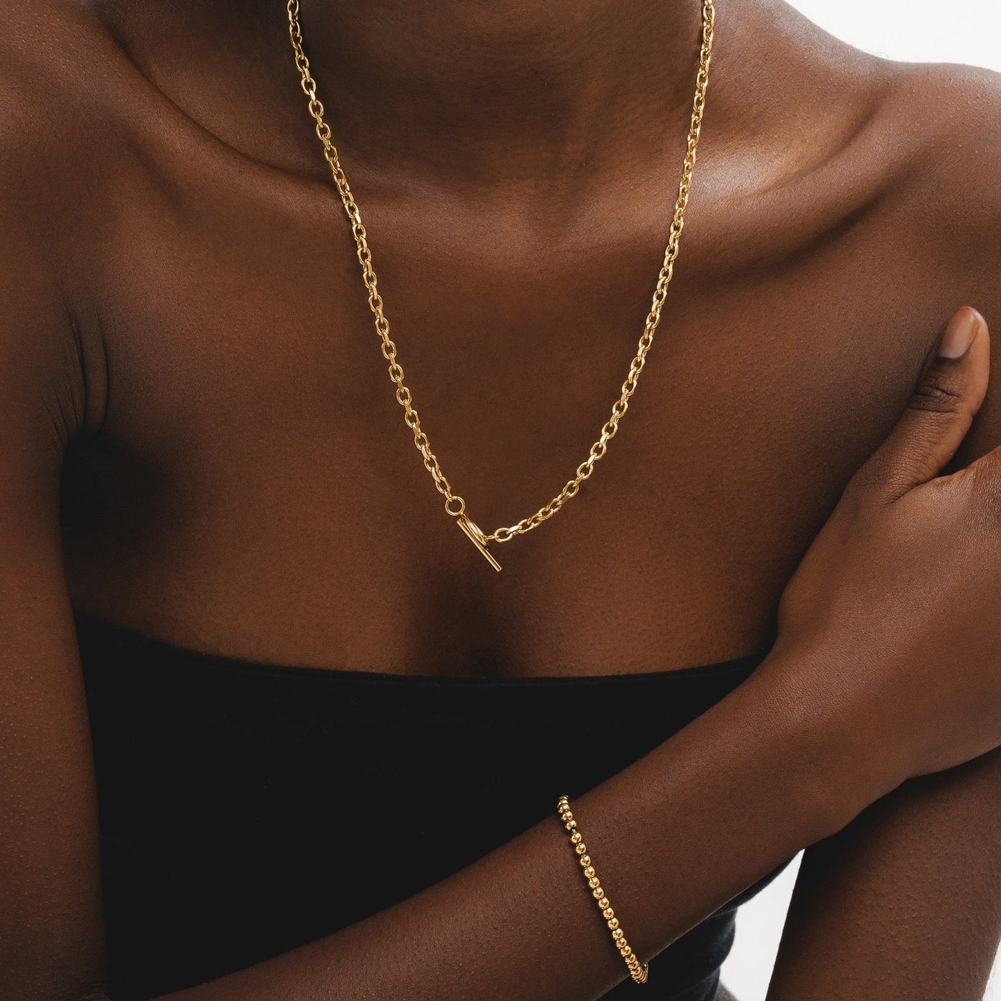 Halsbandet är designat med en tidlös T-bar som ger en unik touch. Det är idealiskt för både vardag och fest, vilket gör det till en mångsidig del av din smyckeskollektion.
