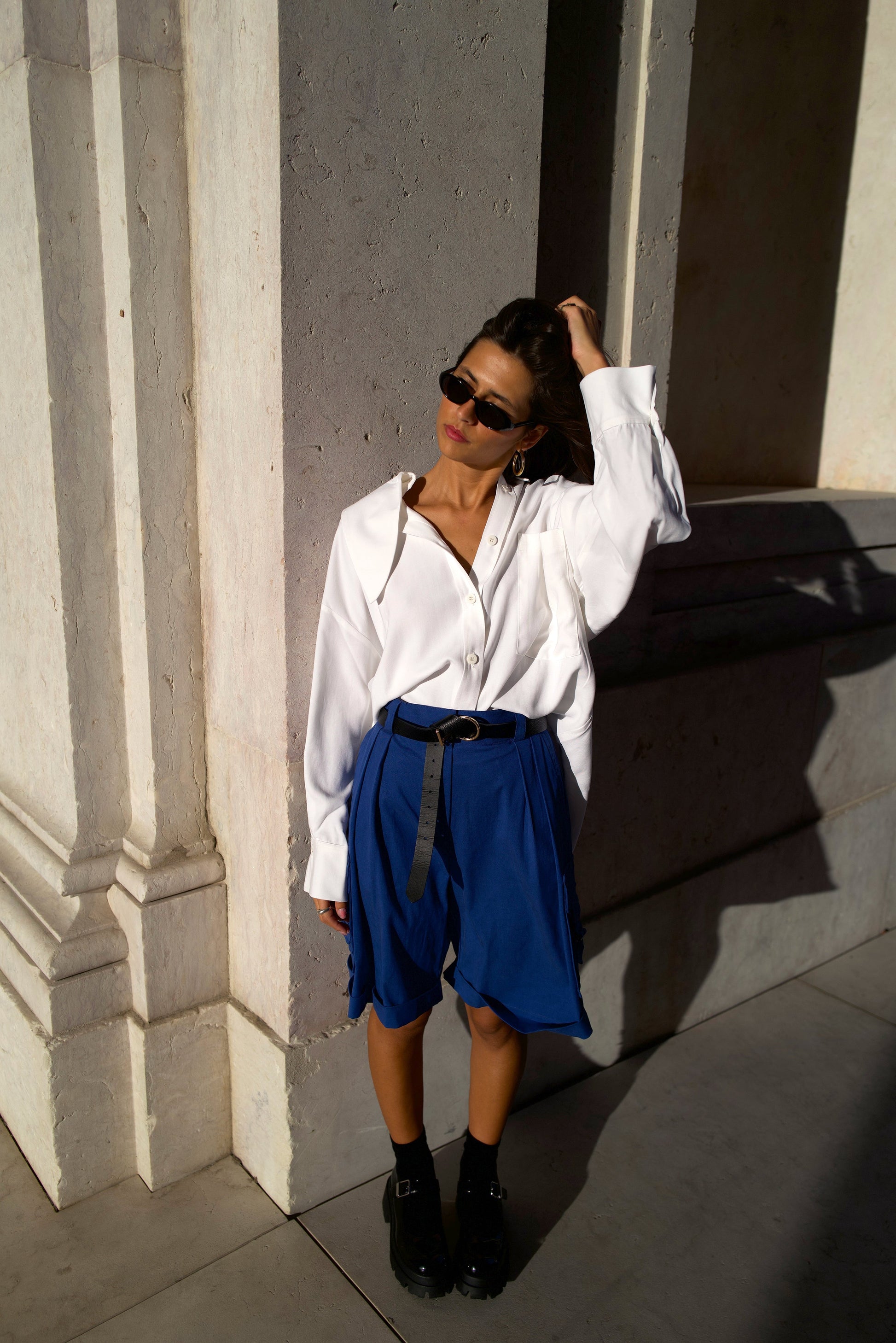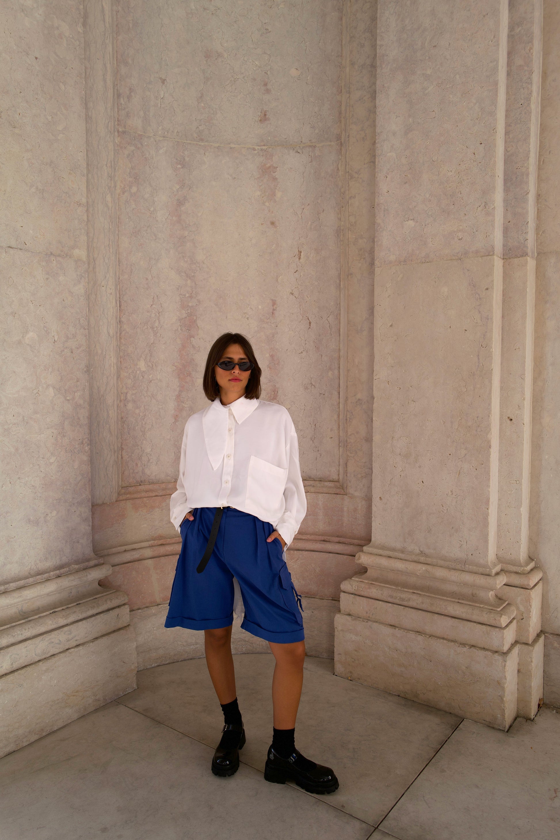 Med en bred och militärinspirerad passform är dessa shorts mångsidiga nog att bäras med en asymmetrisk skjorta eller en av våra stickade plagg. De är tillverkade med fokus på både stil och funktion, vilket gör dem till ett utmärkt val för olika tillfällen.