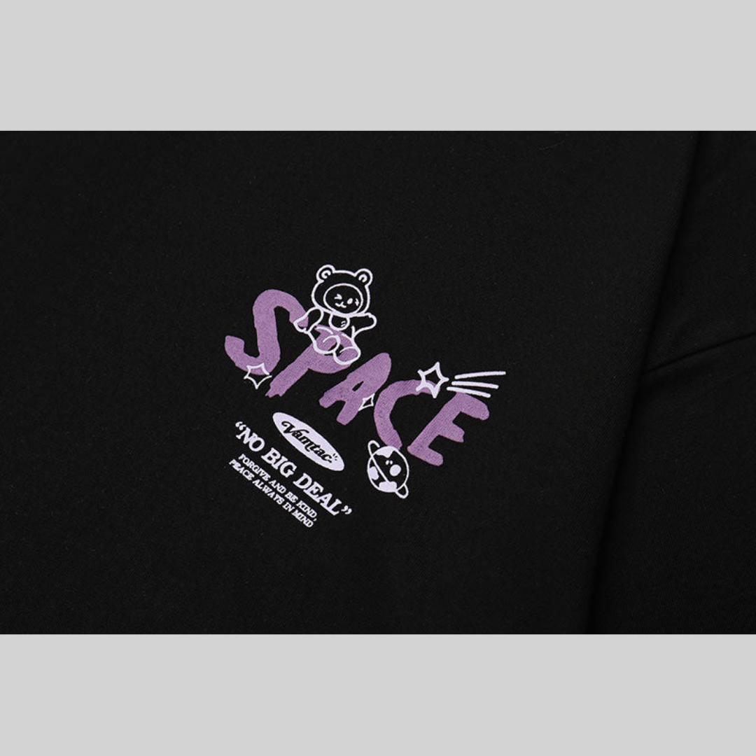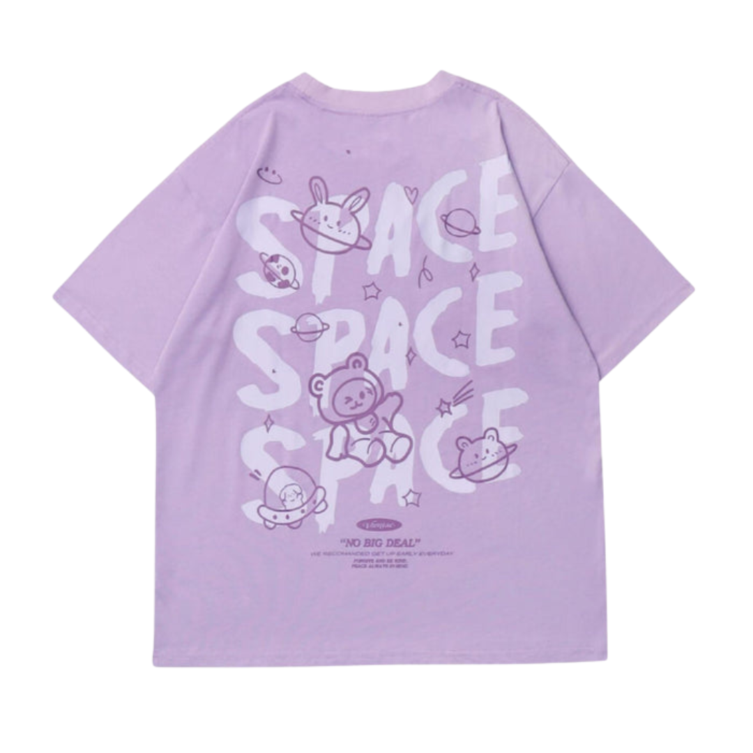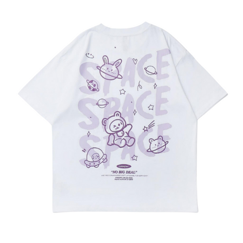 Denna t-shirt har en unik design med en söt cartoon-björn och kaniner i rymden, vilket gör den till ett utmärkt val för både avslappnade och trendiga tillfällen. Den är tillverkad av en mjuk bomull/polyesterblandning som ger en skön känsla mot huden.