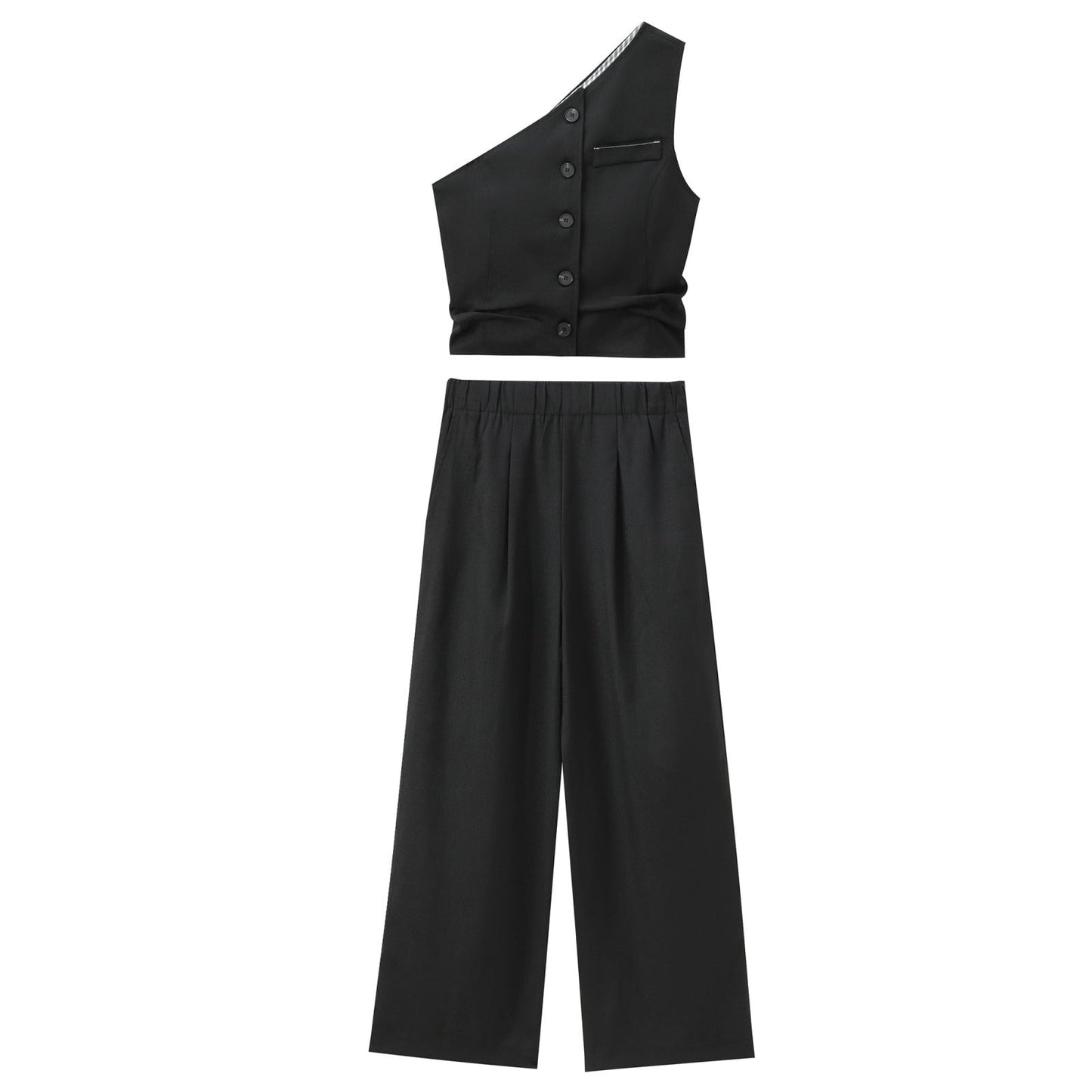 Designen är enkel men elegant, med en monokrom färg som gör den lätt att matcha med olika plagg. Denna outfit är idealisk för avslappnade tillfällen eller en dag på stan.
