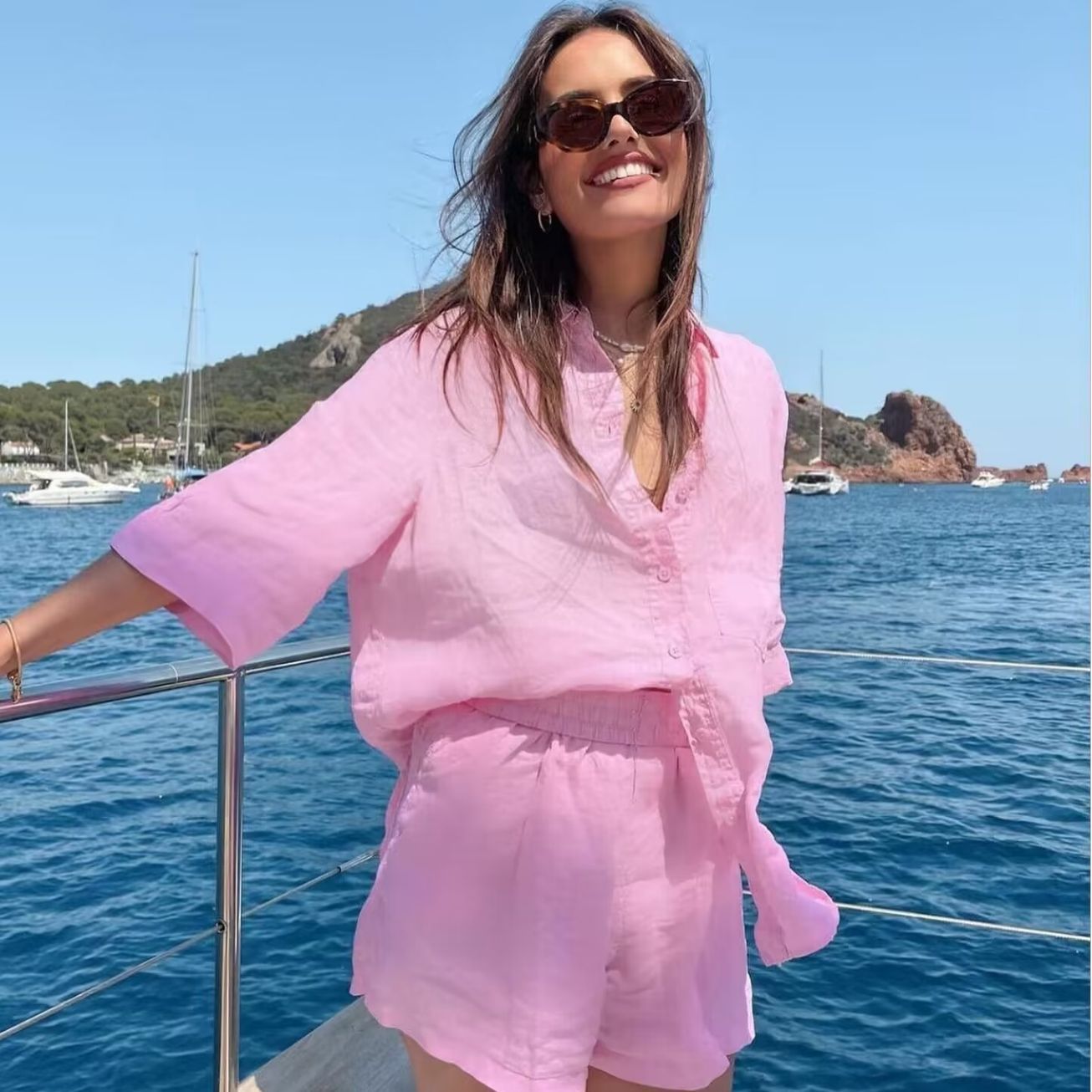 Setet består av en skjorta med tre fjärdedelars ärmar och byxor som ger en avslappnad passform. Det är idealiskt för både avslappnade och mer informella tillfällen, vilket gör det till ett mångsidigt val för din garderob.