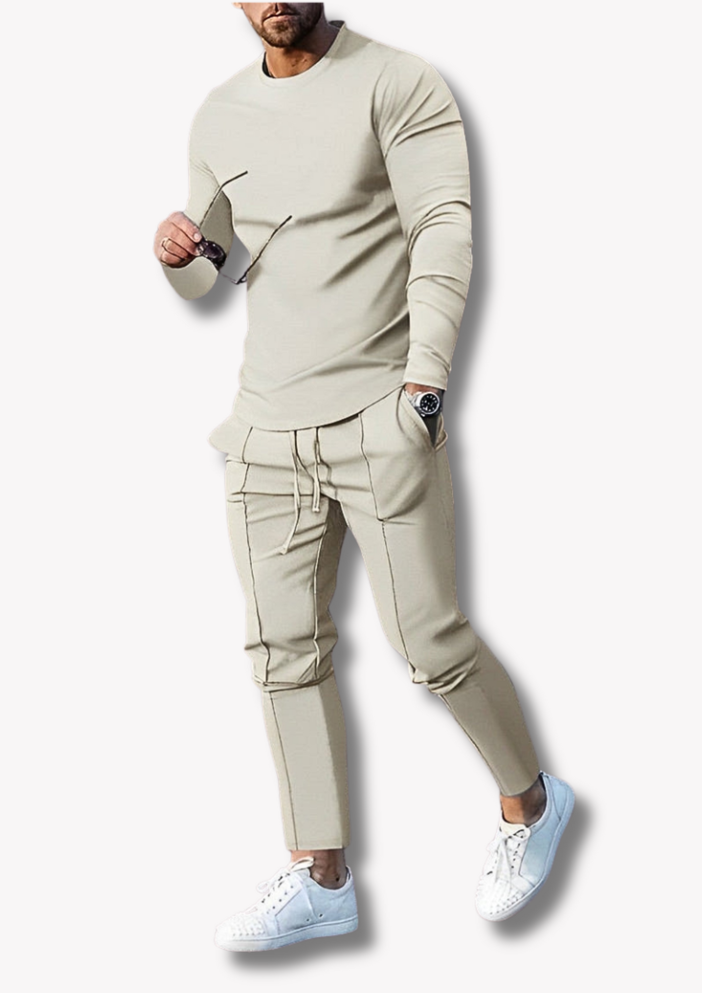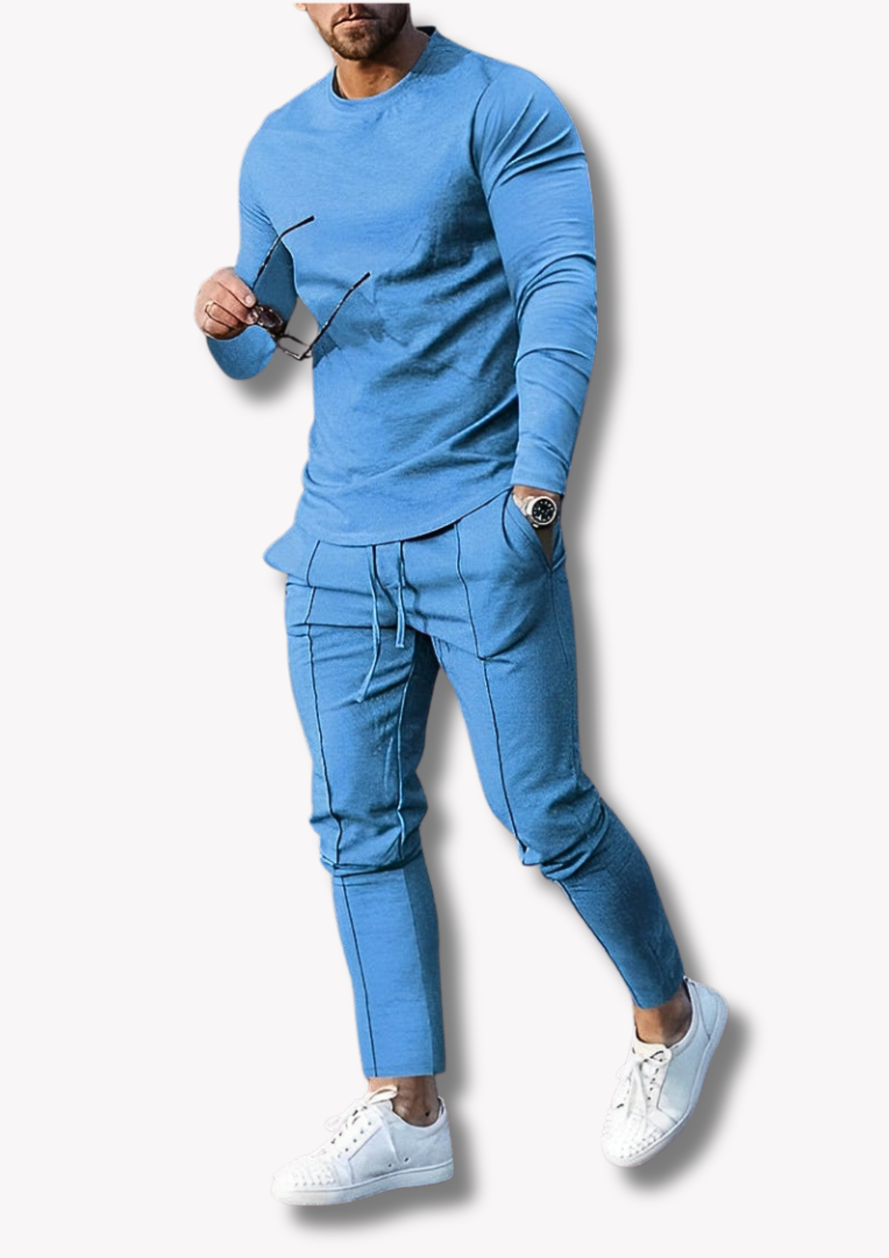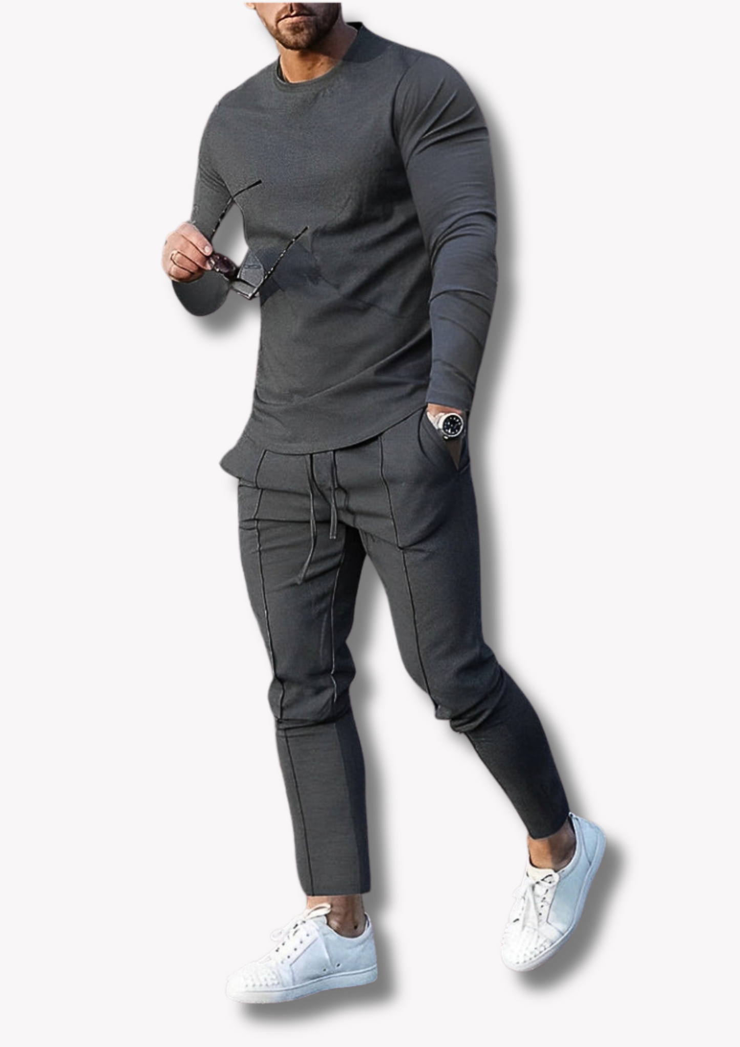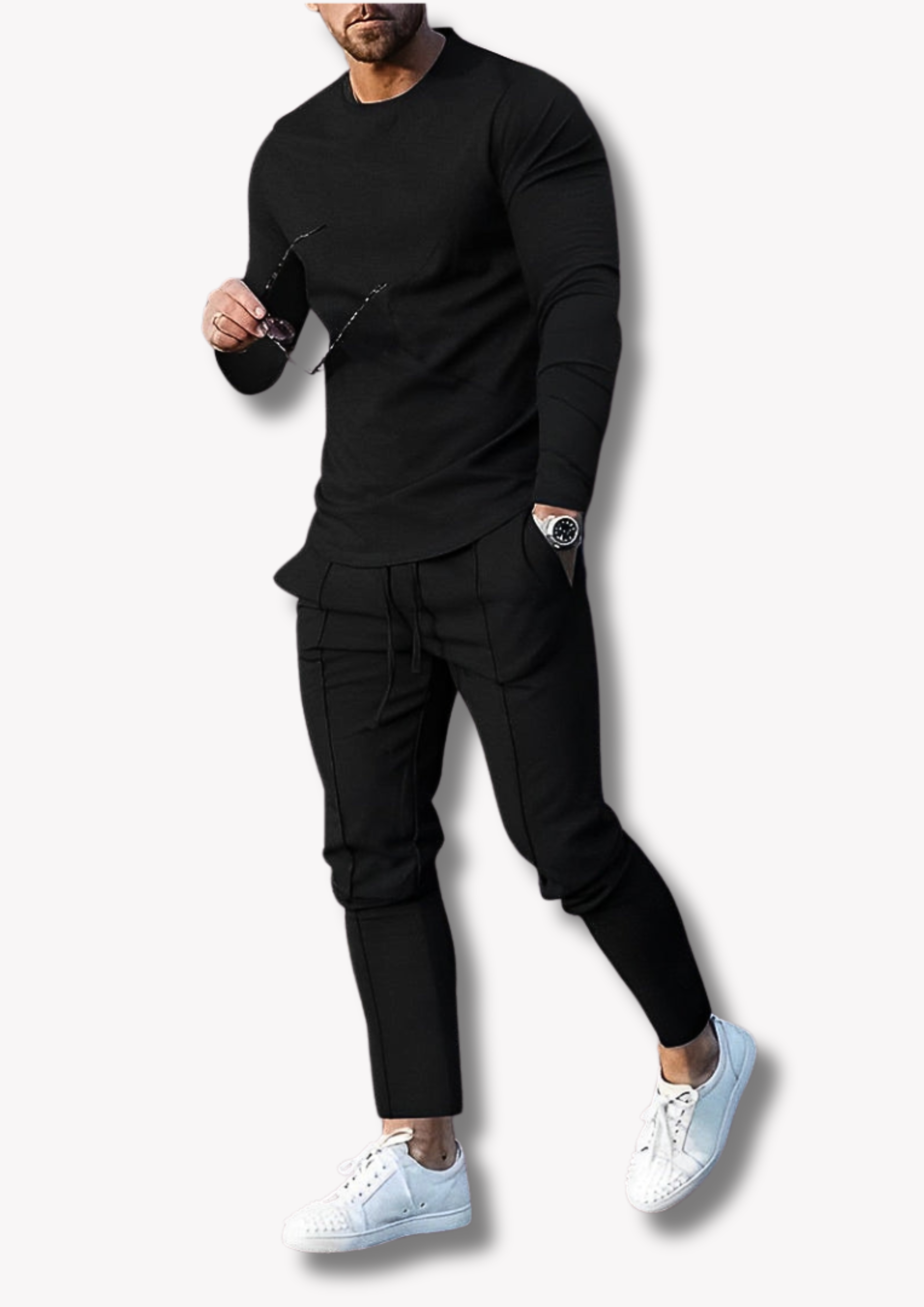 Upplev en perfekt balans mellan stil och komfort med vårt herrset bestående av tröja och byxor. Denna uppsättning är designad för att ge dig en känsla av elegans och bekvämlighet hela dagen.