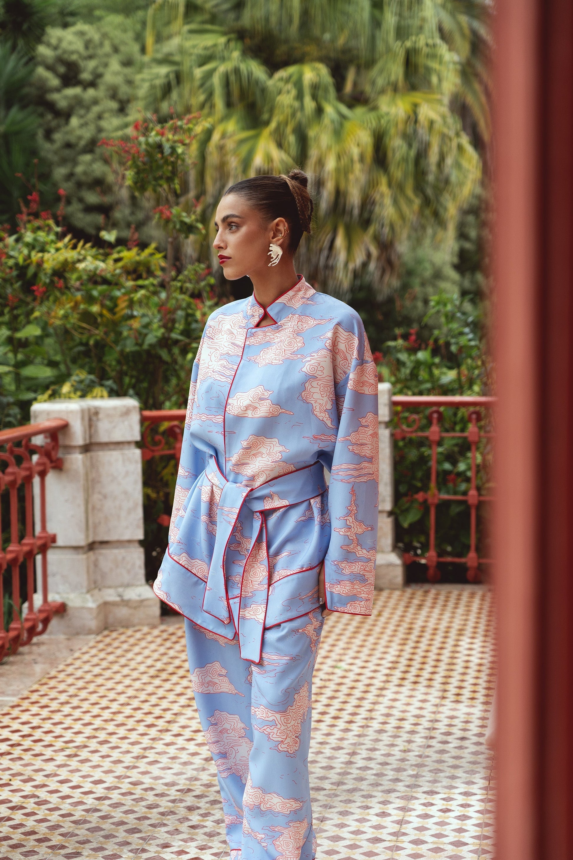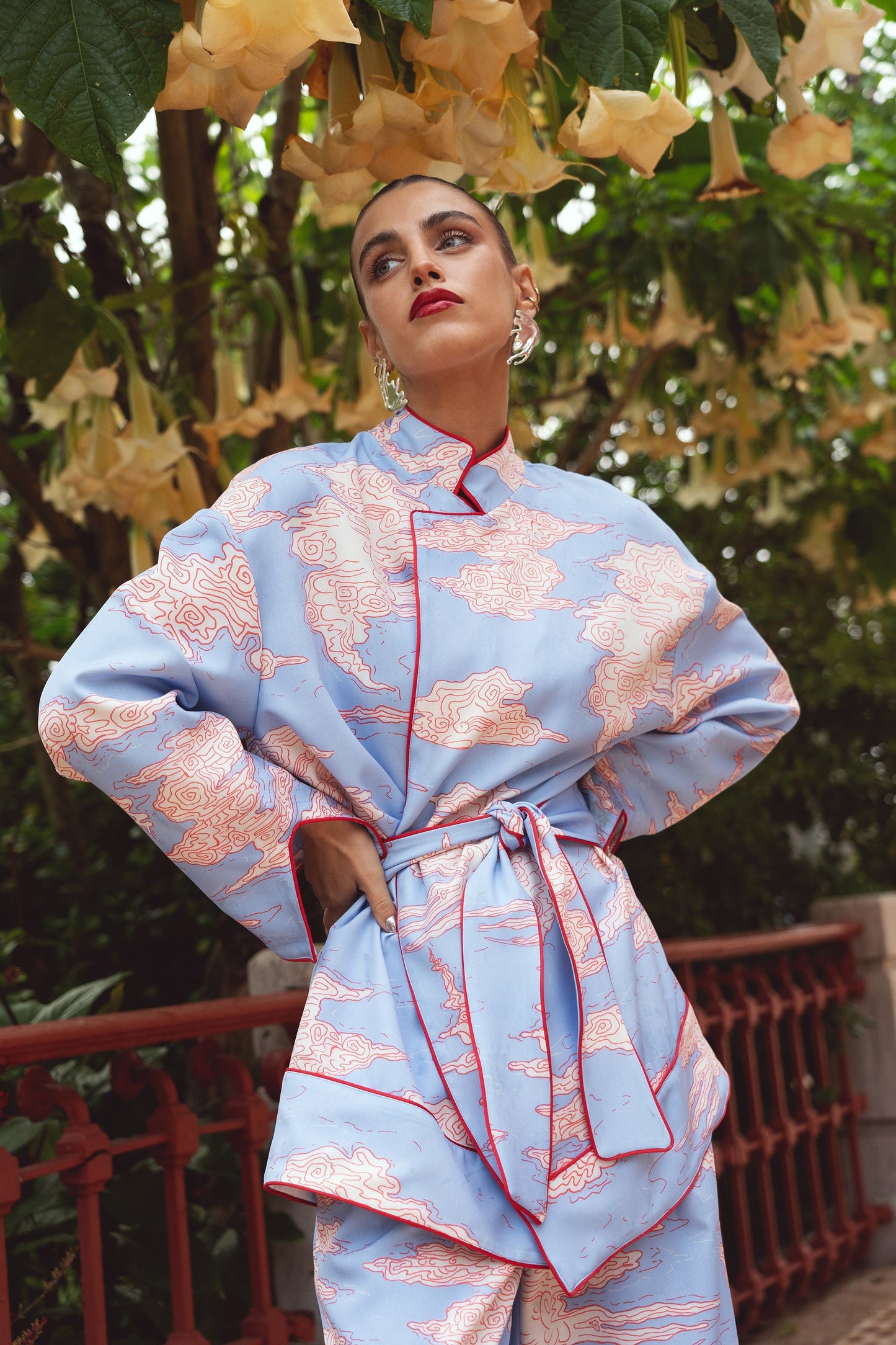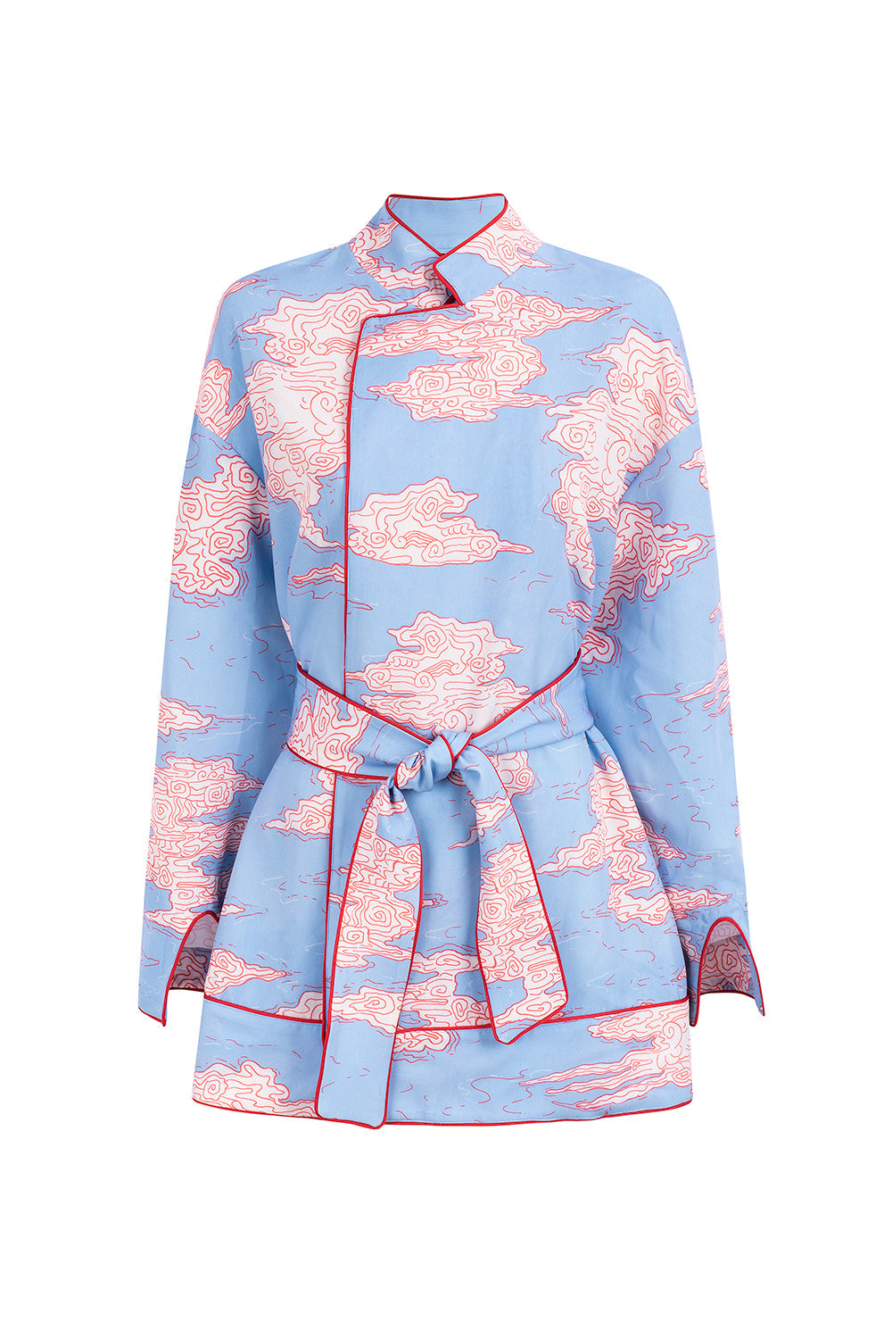 Skjortan har en ståkrage och ovala öppningar vid manschetterna, vilket ger en modern touch. Den kan enkelt stylas med bälten och byxor för en mer uppklädd look, eller med jeans för en avslappnad stil. En fantastisk detalj är att skjortan levereras med ett bälte, vilket gör den ännu mer mångsidig.