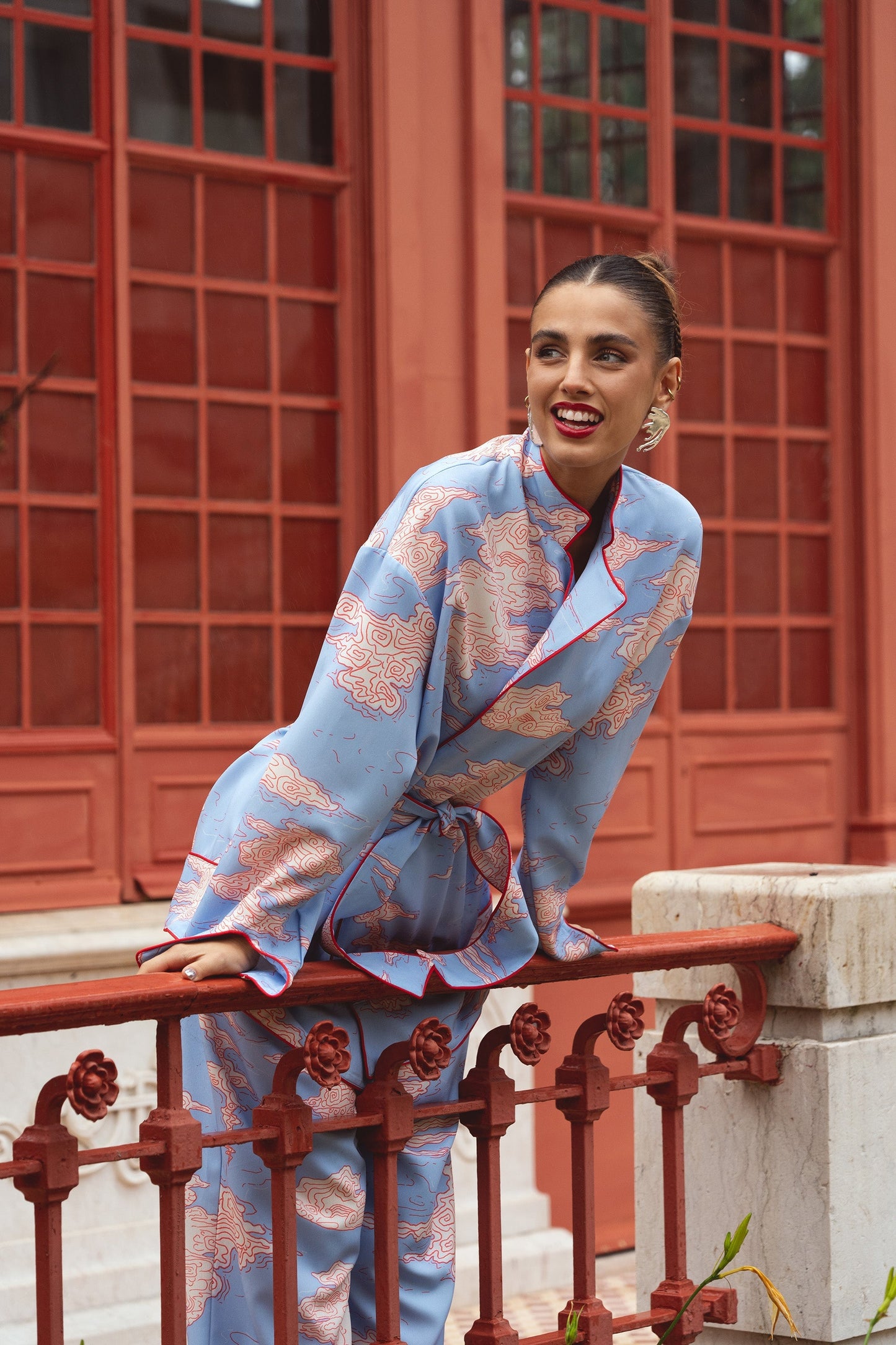 Herrskjorta Kinesisk Inspiration med Bälte i Polyester Elastan