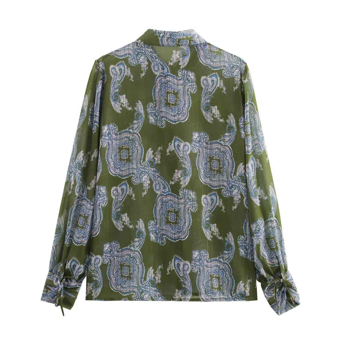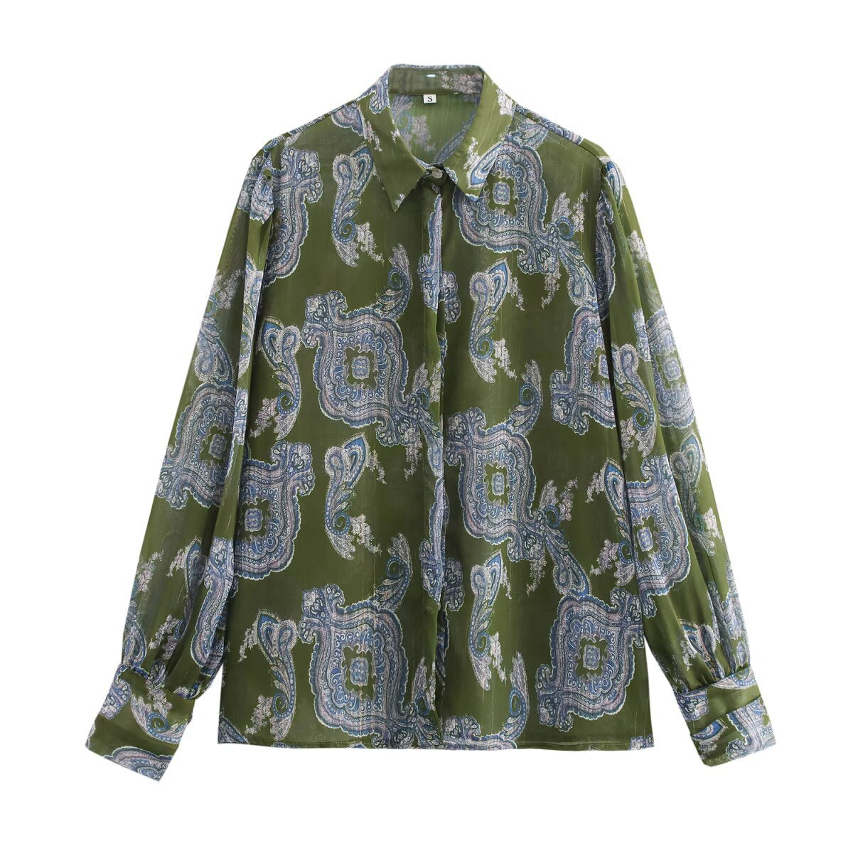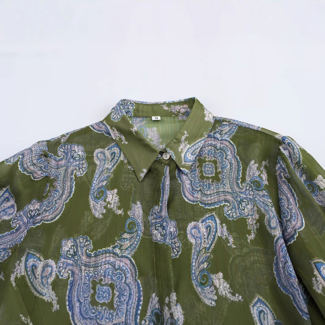 Skjortan har en vacker mörkgrön krage och ett iögonfallande mönster med växter, vilket gör den till ett utmärkt val för både avslappnade och mer formella sammanhang. Den långa ärmen ger en sofistikerad look som är lätt att styla.