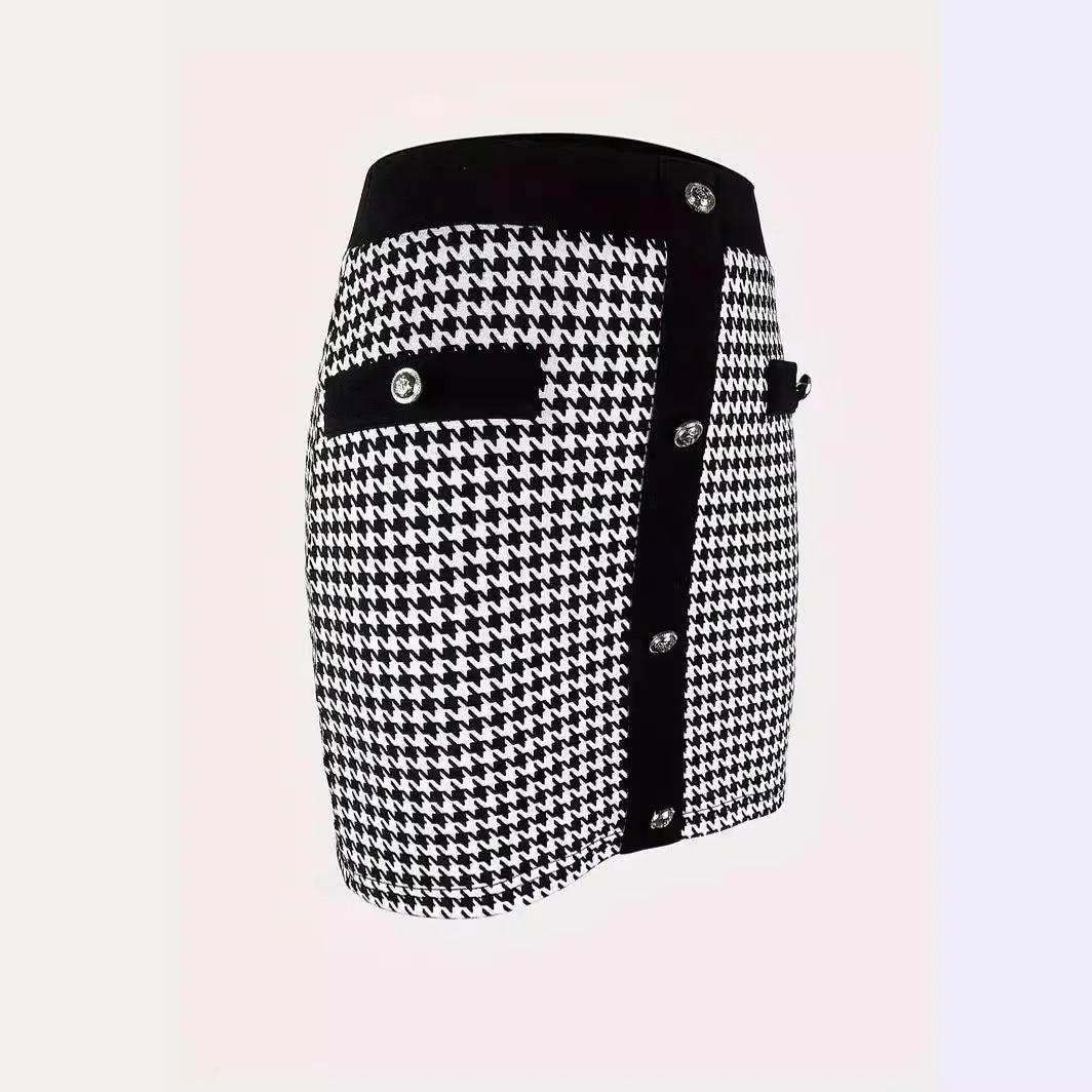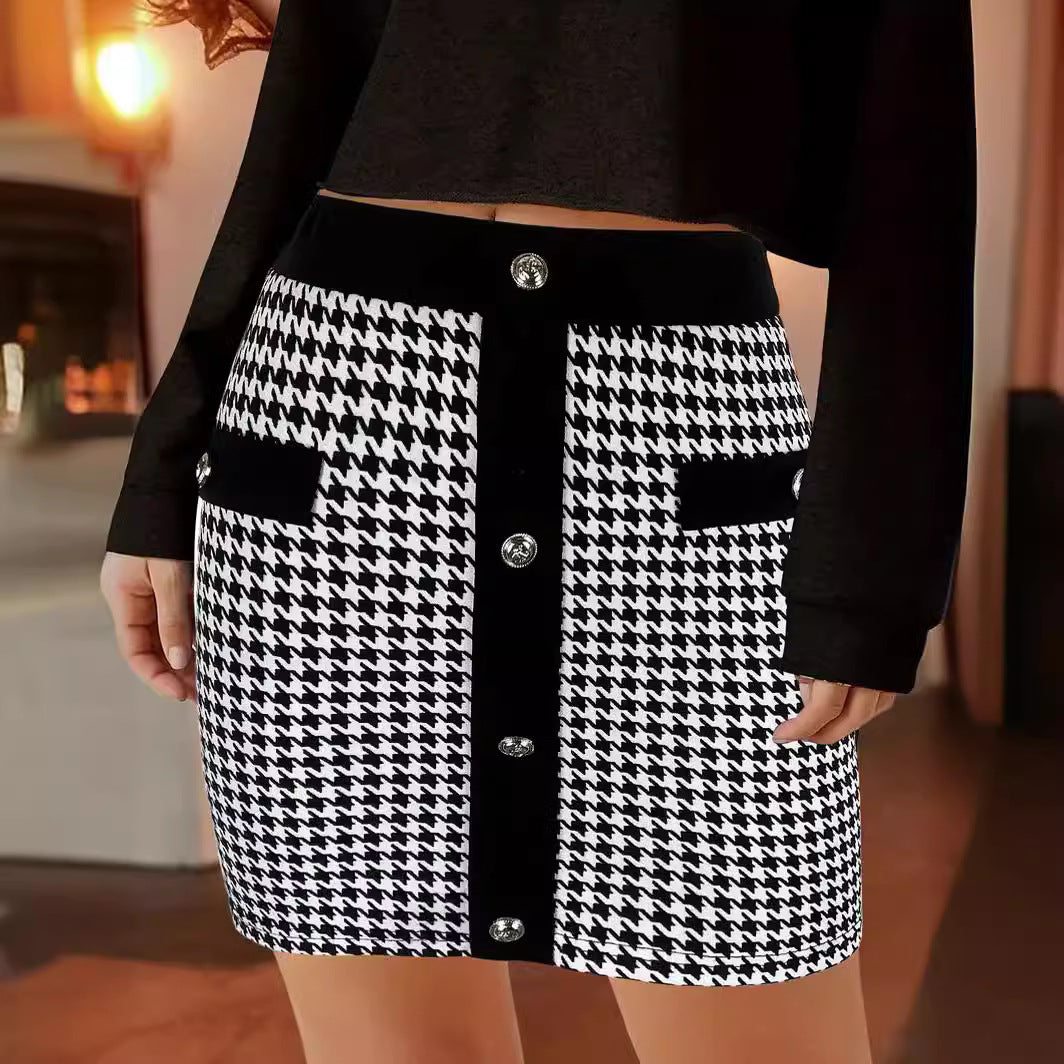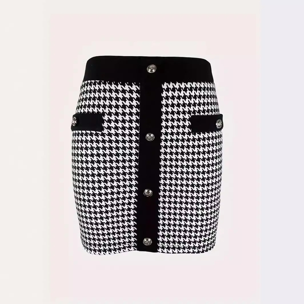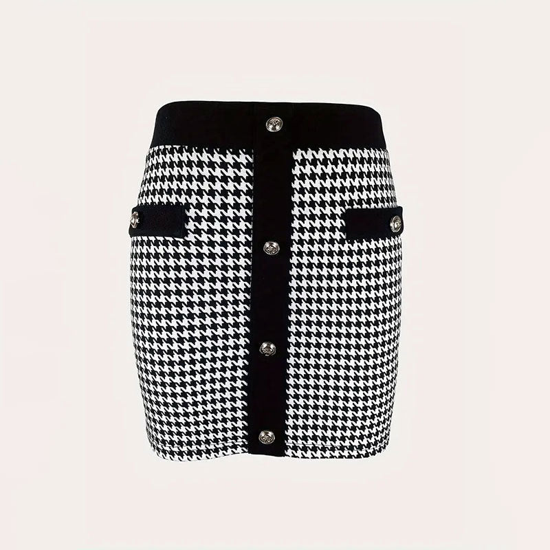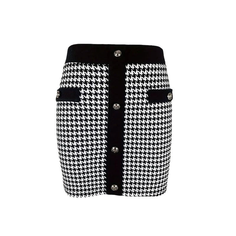 Kjolen har ett attraktivt mönster i klassiskt svartvitt och är tillverkad av högkvalitativt tyg som säkerställer både hållbarhet och komfort. Med fashionabla knappdetaljer och praktiska fickor får du både stil och funktionalitet.
