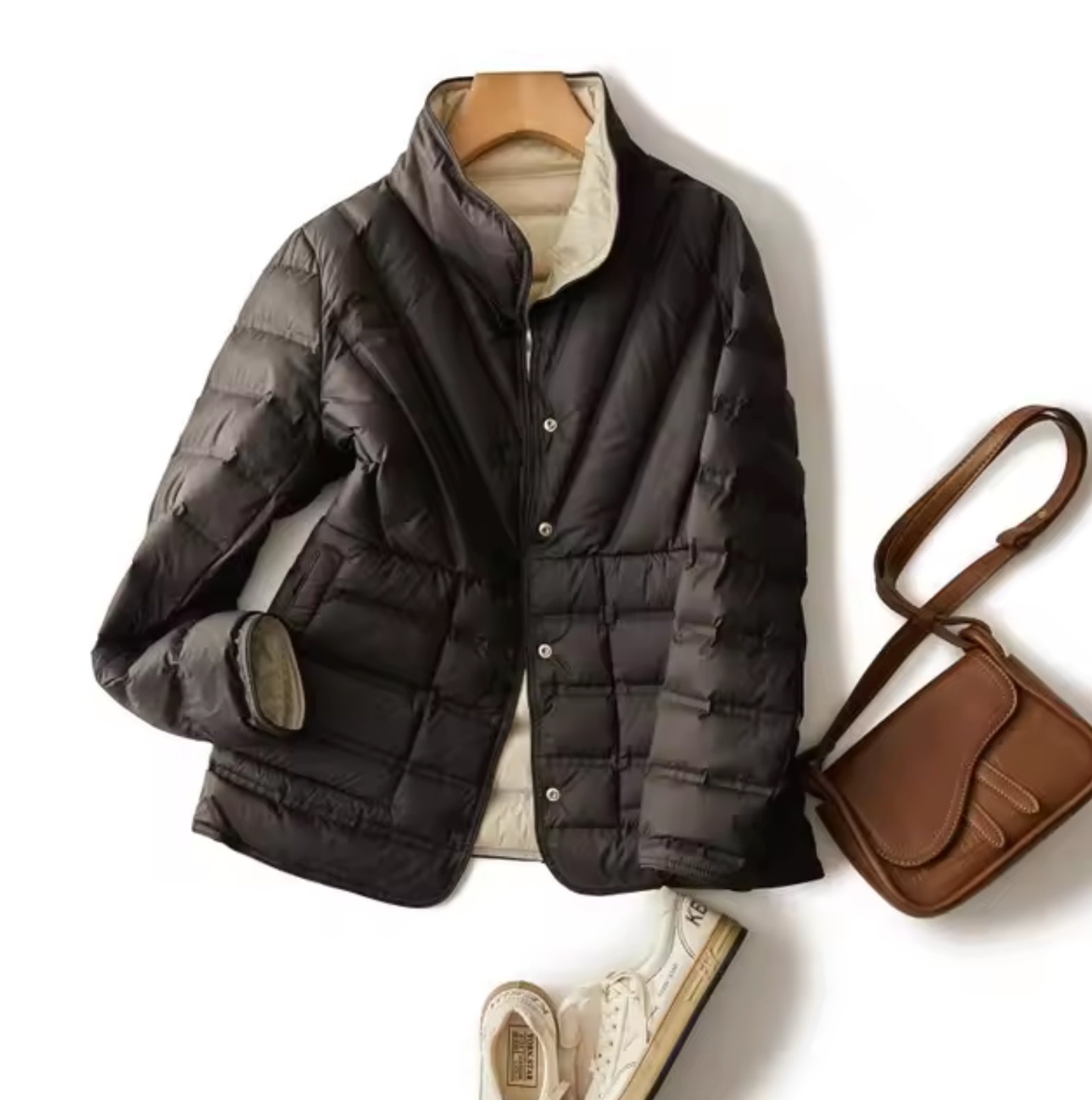 Med en elegant silhuett och en lätt design är denna jacka idealisk för både avslappnade och mer formella tillfällen. Den är fylld med 90 % vit anddun, vilket ger utmärkt isolering utan att vara skrymmande.