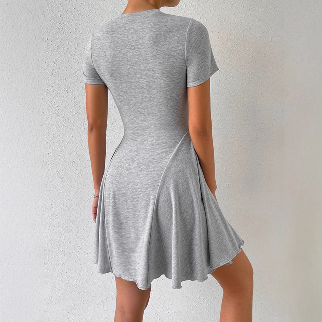 Denna klänning har en A-Line silhuett som ger en smickrande passform. Den enfärgade designen i grått gör den lätt att styla för både vardag och fest. Med korta ärmar och en mjuk mjölk silke känsla, är den idealisk för varma dagar.