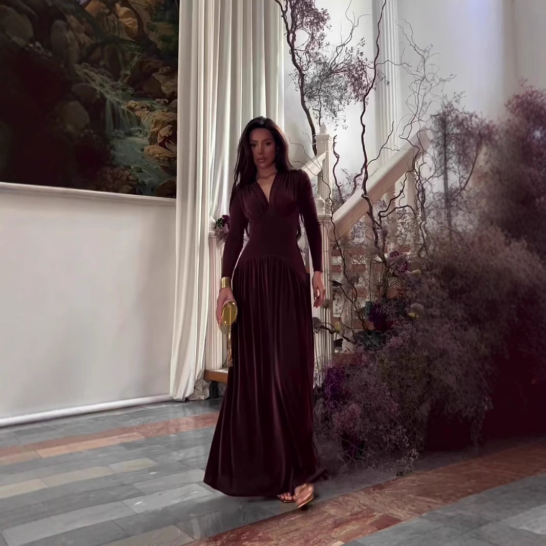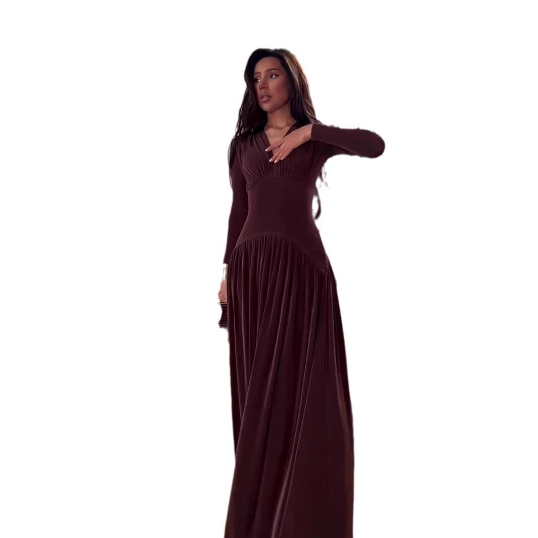 Kvinna Lång Klänning V-Neck Högkvalitativt Tyg