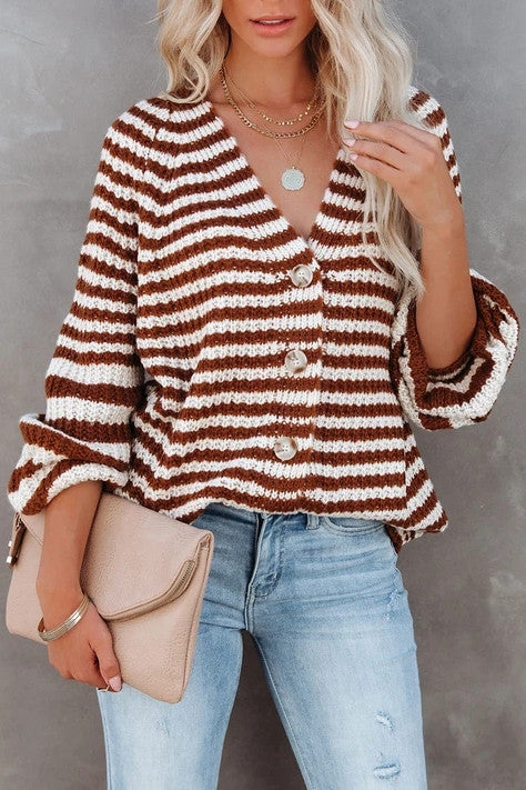 Cardiganen har en vacker randig design och lanternärmar som ger en unik touch. Den är idealisk för både avslappnade och mer formella tillfällen, vilket gör den till ett mångsidigt plagg i din garderob.