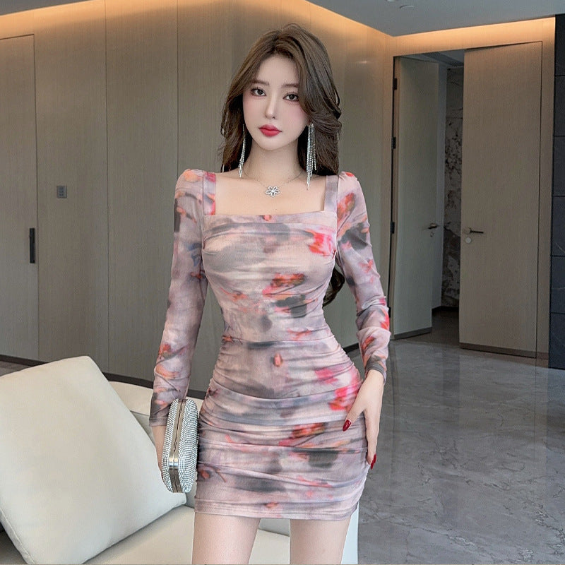 Kvinna Långärmad Klänning Djupt Utskuren Tryckt Högkvalitativt Tyg