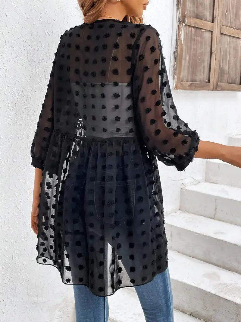 Denna topp är designad med vackra spetsdetaljer som ger en feminin touch. De långa ärmarna skapar en klassisk silhuett, vilket gör den idealisk för både avslappnade och mer formella evenemang.