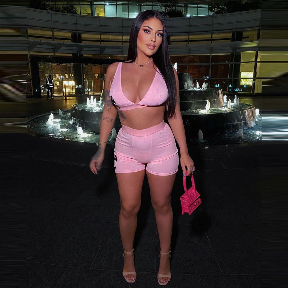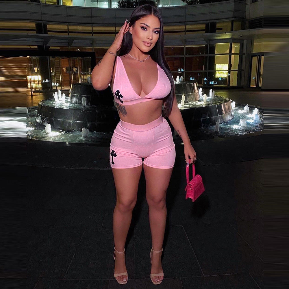 Uppsättningen består av en ärmlös crop top och högmidjade shorts, båda i en elegant monokrom design. Det dekorativa tvärtrycket ger en modern touch, vilket gör den idealisk för både träning och avslappnade dagar.