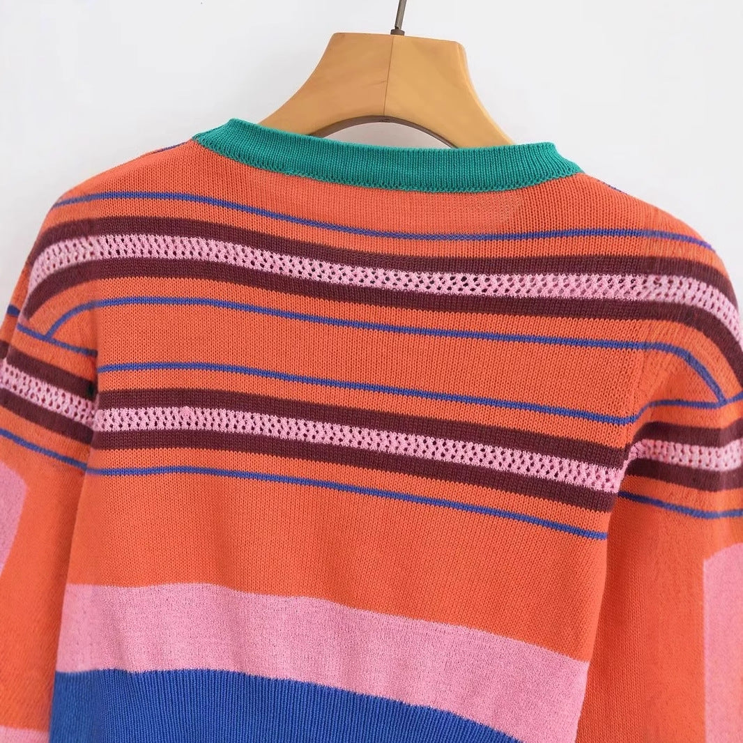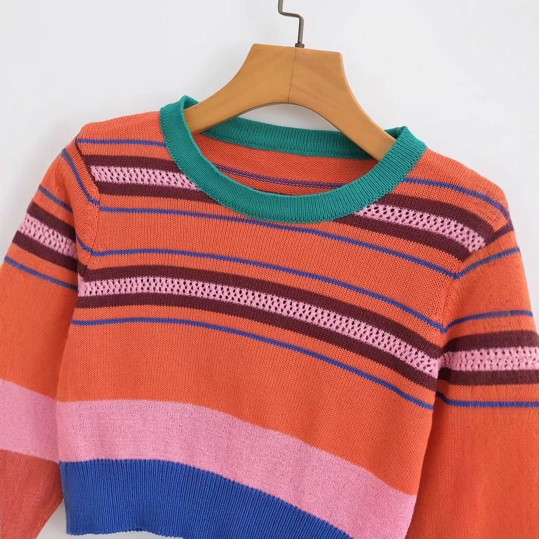 Denna tröja är designad med ett modernt snitt som framhäver midjan och ger en elegant silhuett. De färgglada ränderna tillför en lekfull touch, vilket gör den idealisk för både vardag och fest.