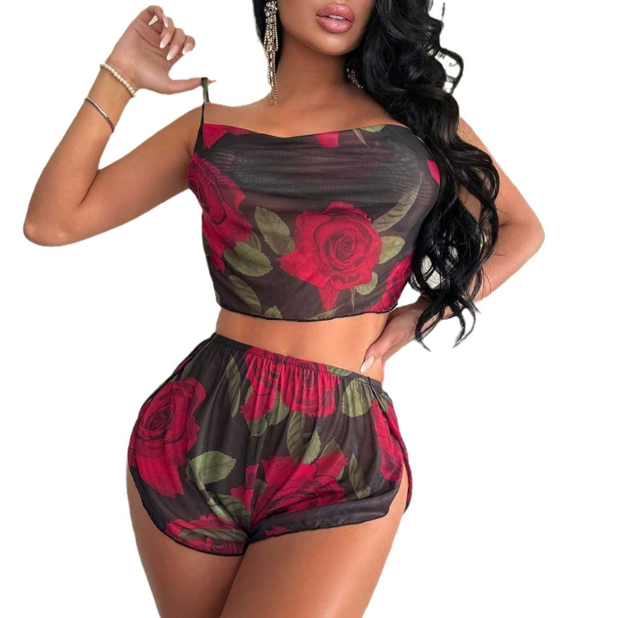 Kvinnor Blommig Skördetopp och Shorts Set Lätt Material