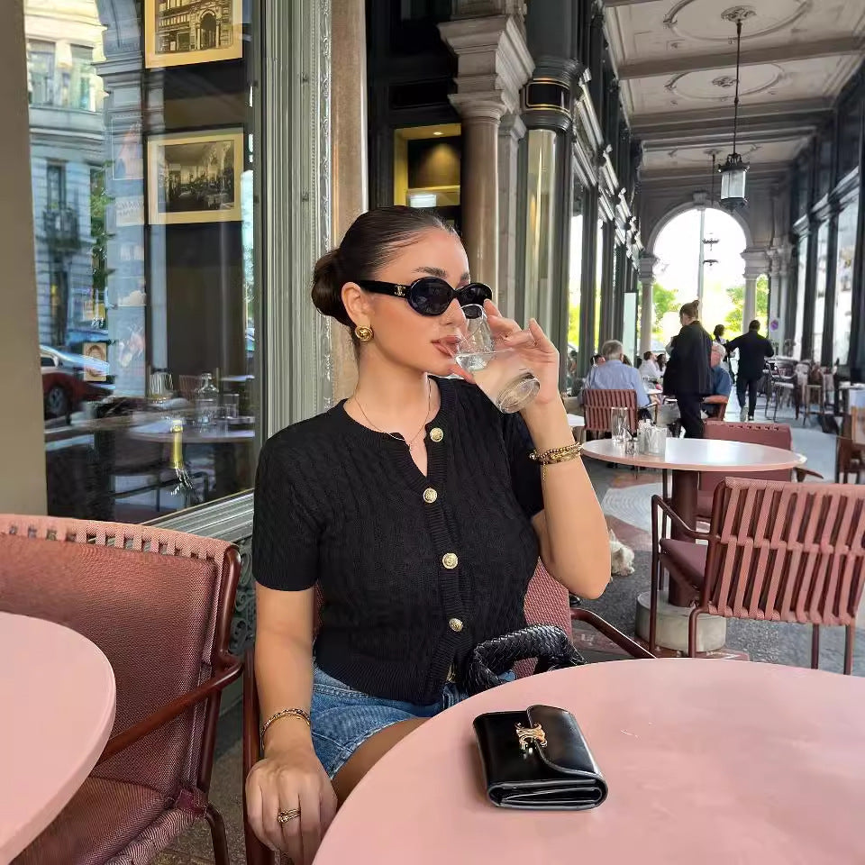 Denna cardigan har en tidlös design med en klassisk cirkulär halsringning och dekorativa knappar som ger en extra touch. Den är mångsidig nog att bäras både till avslappnade byxor och finare kjolar, vilket gör den till ett utmärkt val för både vardag och fest.