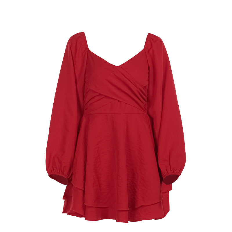 Klänningen har en vacker design med långa puffärmar som ger en modern och trendig känsla. Den tidlösa V-halsen framhäver din feminina sida och gör den lätt att styla med olika accessoarer. Oavsett om det är en fest eller en avslappnad dag, kommer denna klänning att vara ett utmärkt val.