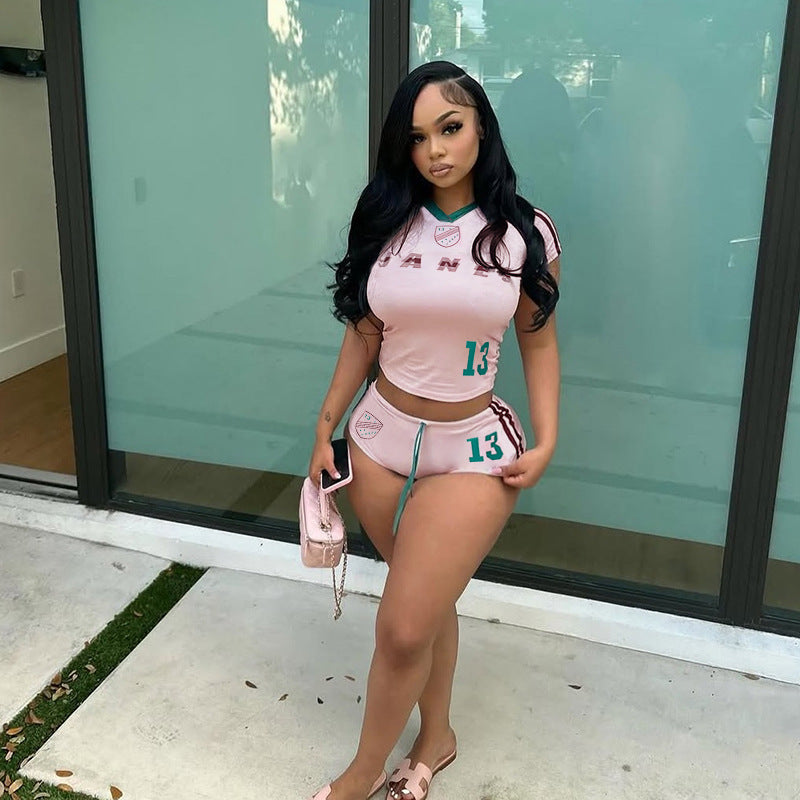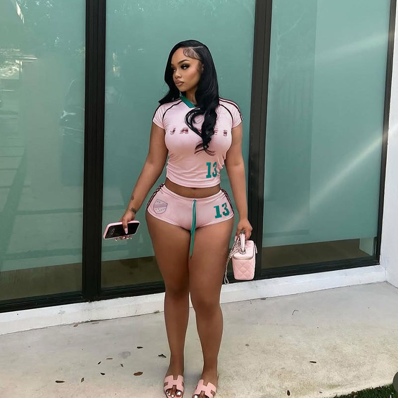 Uppsättningen inkluderar en figur-betonad skördetopp med korta ärmar och en cirkulär halsringning, tillsammans med matchande shorts som ger en smickrande silhuett. Det kreativa trycket på både toppen och shortsen framhäver den sportiga stilen och ger en aktiv look.