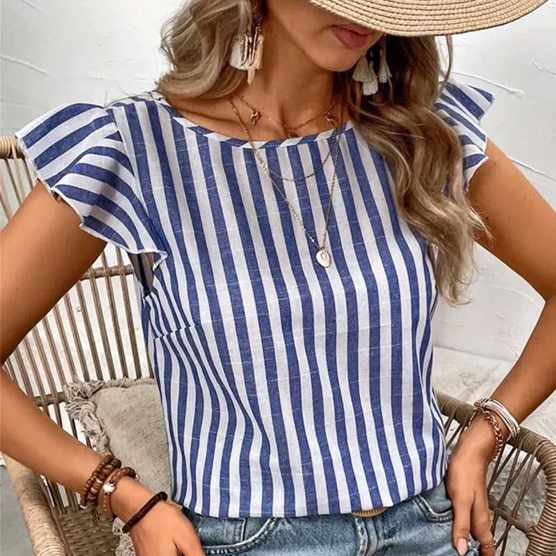 Upplev stil och komfort med vår kvinnors topp med V-ringning och randiga detaljer. Denna topp är perfekt för varma dagar och ger en känsla av fräschör och elegans.