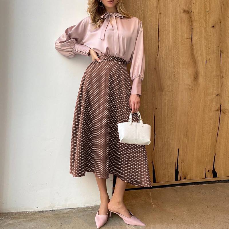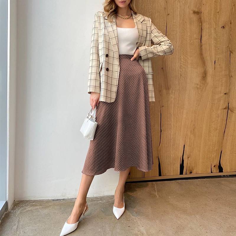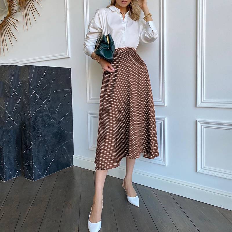 Kjolen har en mid-kalv längd och är tillverkad av högkvalitativ polyester, vilket ger en lätt och luftig känsla. Den vintage-inspirerade stilen gör den idealisk för både vardagliga och mer formella tillfällen.
