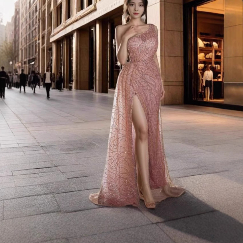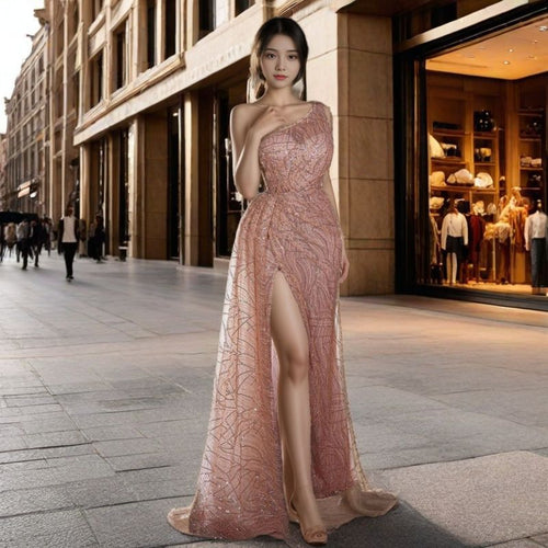 Denna fantastiska aftonklänning är designad för att få dig att känna dig som en stjärna. Med sin eleganta silhuett och glittrande detaljer kommer du att stråla på varje tillställning.