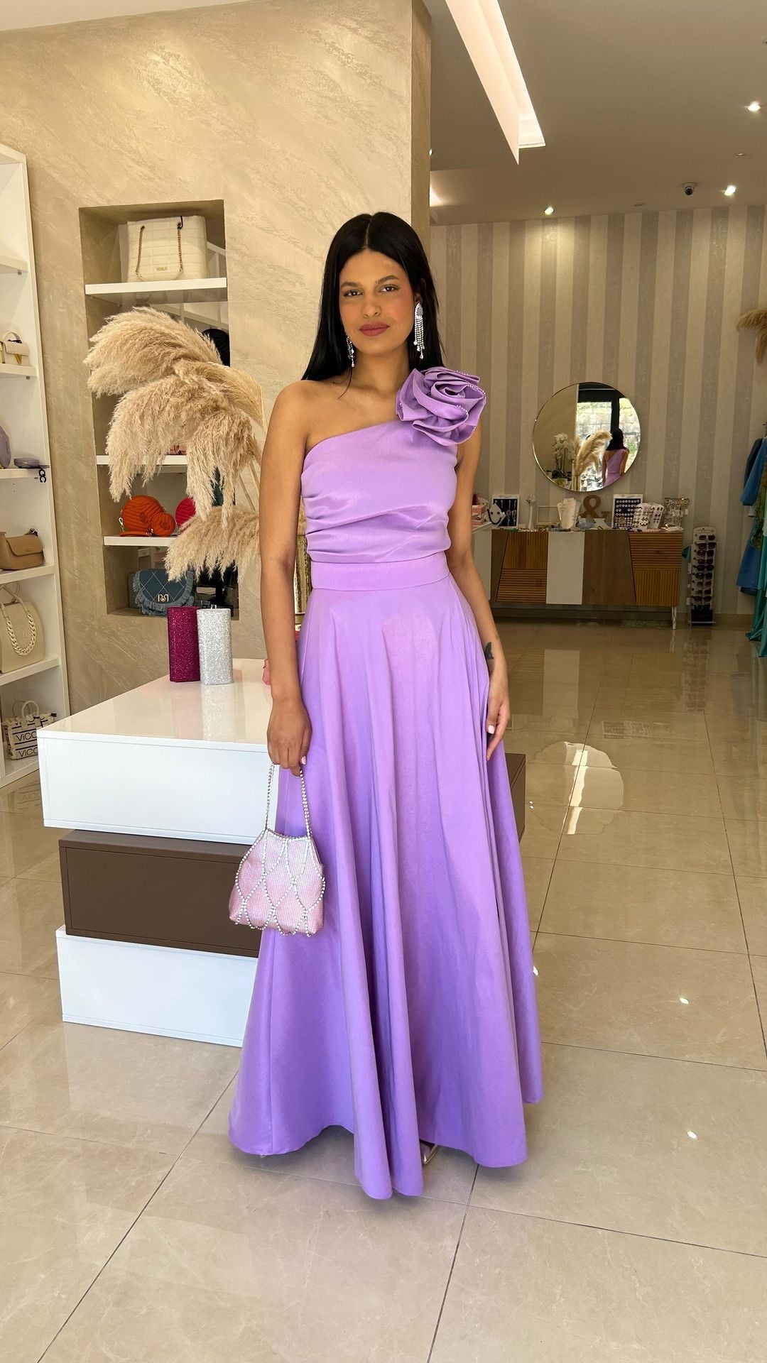 Klänningen har en asymmetrisk axelstil och är ärmlös, vilket ger en modern och trendig look. Den långa längden och den patchwork-inspirerade designen gör den idealisk för bröllop, fester eller andra festliga tillfällen.